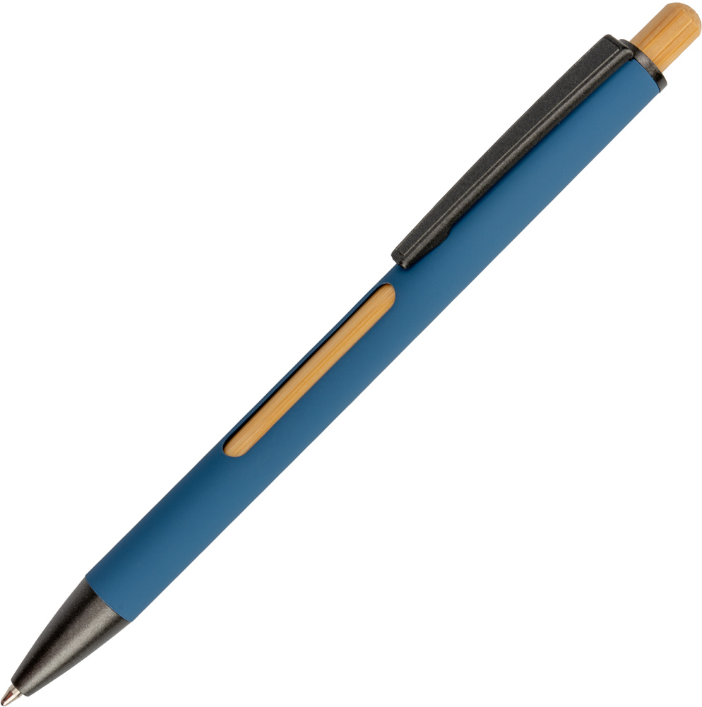 Długopis wykonany z aluminium z recyklingu, metalowym klipsem, bambusowymi akcentami i niebieskim wkładem.