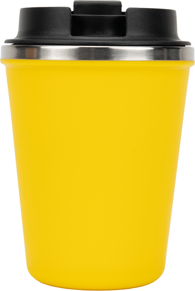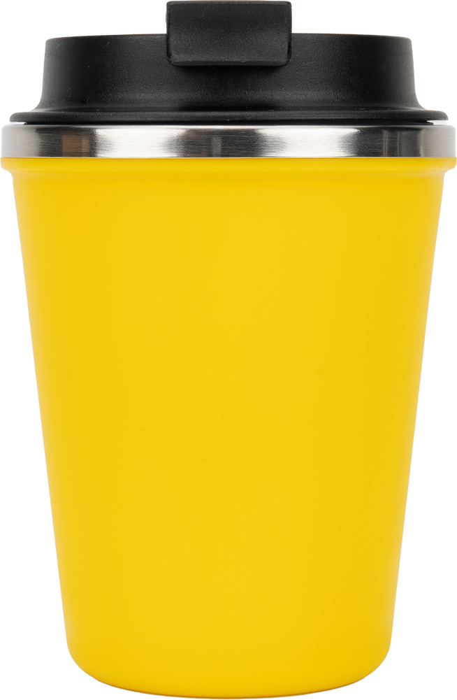 Kubek z podwójnymi ściankami ze stali nierdzewnej, z zewnątrz z plastikową powłoką z materiału pochodzącego z recyklingu, o pojemności 350 ml, z zamykanym ustnikiem.