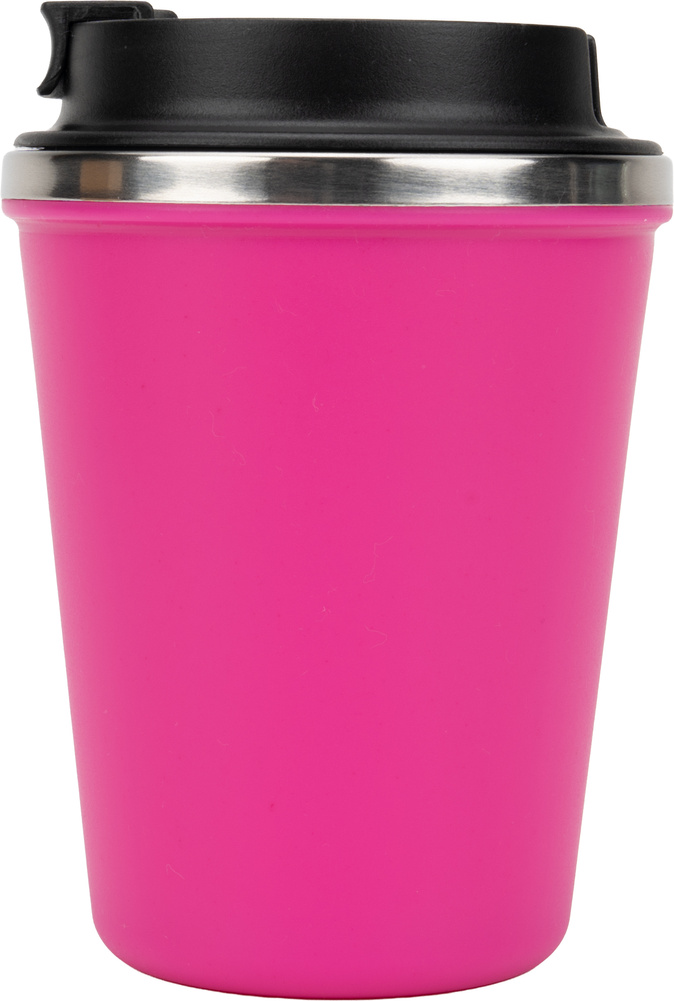 Kubek z podwójnymi ściankami ze stali nierdzewnej, z zewnątrz z plastikową powłoką z materiału pochodzącego z recyklingu, o pojemności 350 ml, z zamykanym ustnikiem.