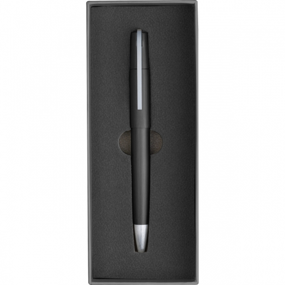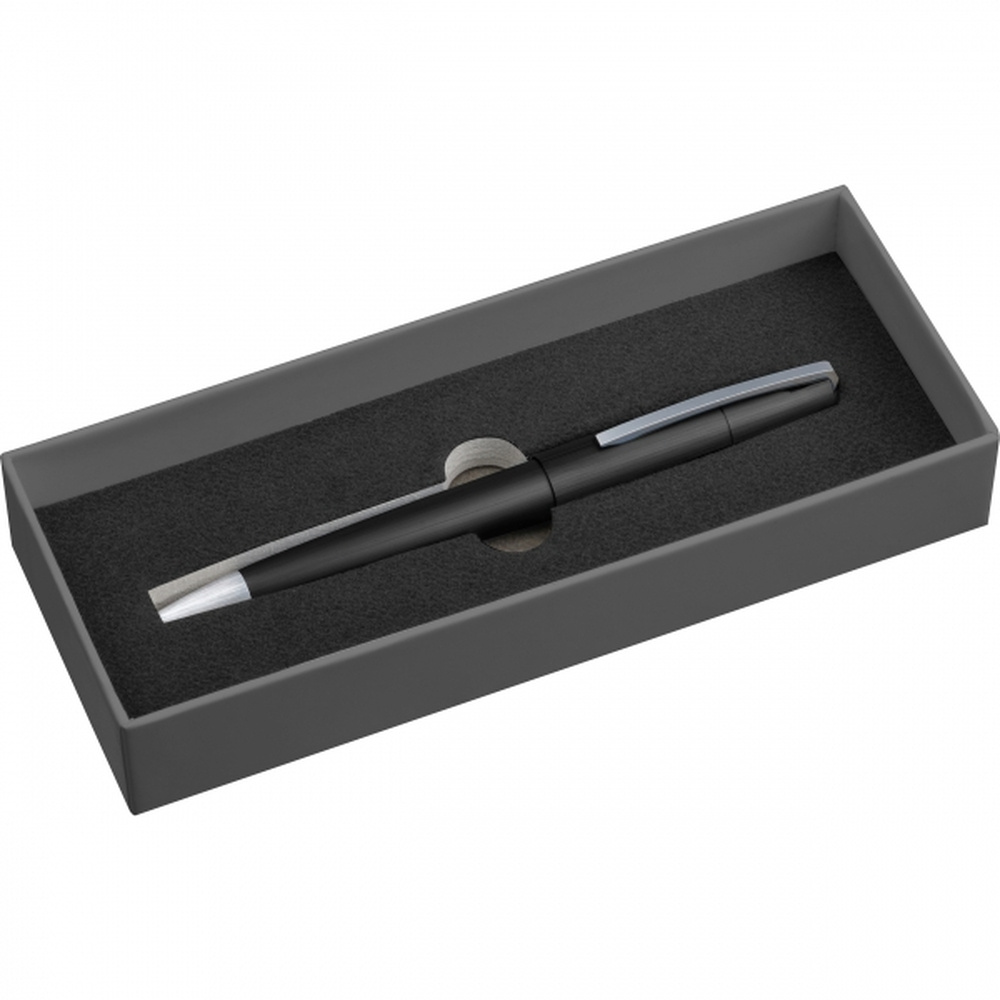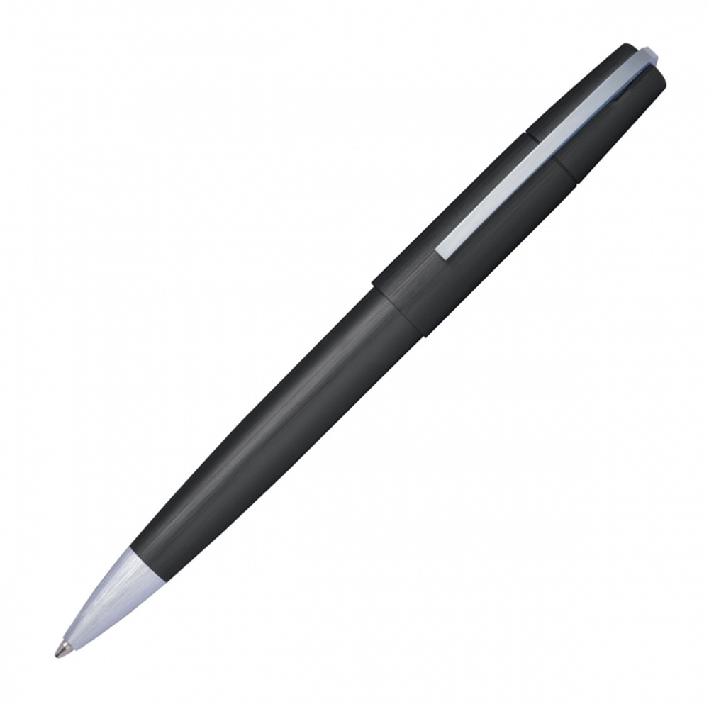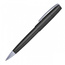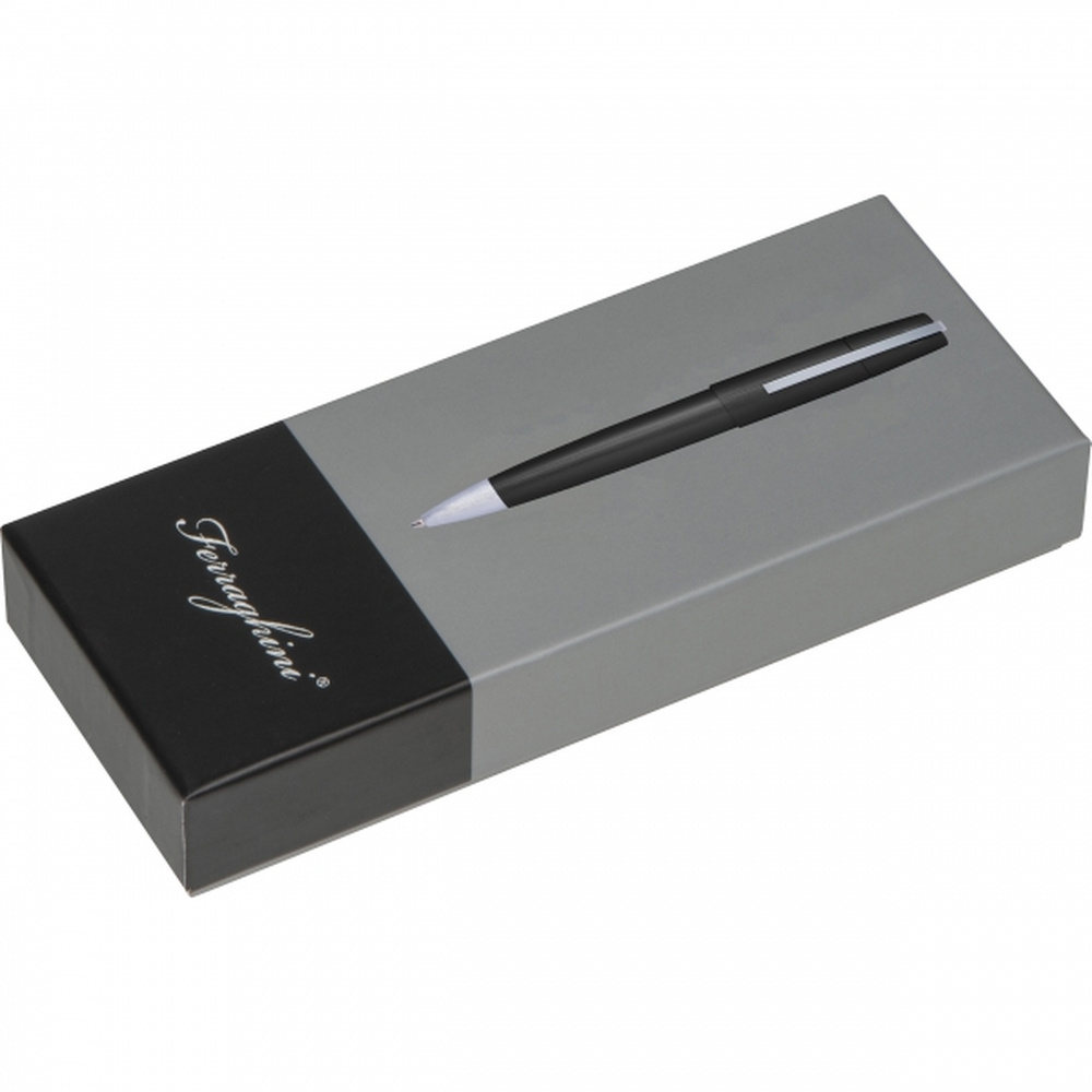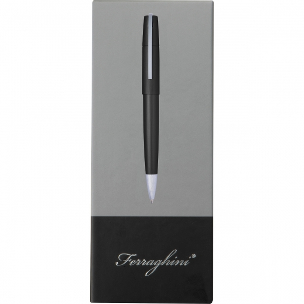 Przekręcany, metalowy długopis marki Ferraghini, ze srebrnymi akcentami i dużym wkładem piszącym na niebiesko.
