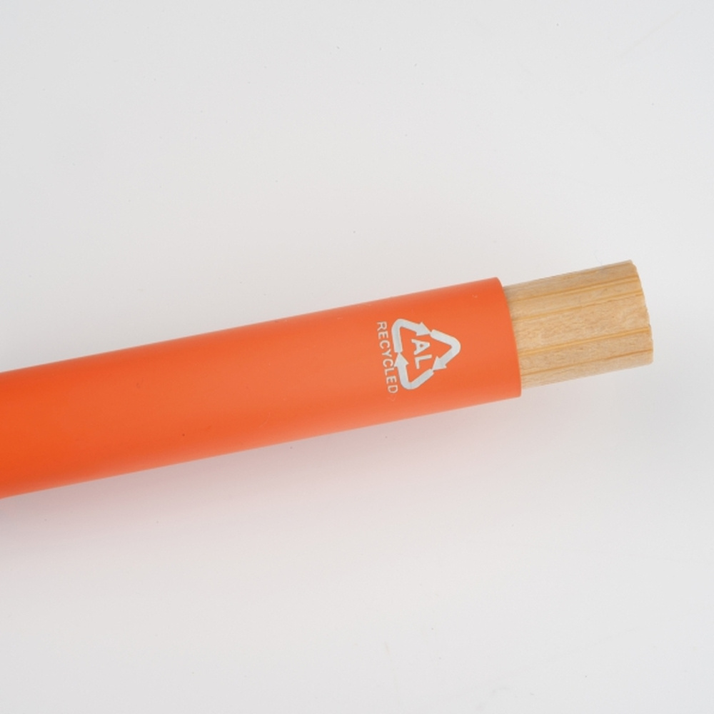 Długopis wykonany z aluminium z recyklingu, bambusowym przyciskiem, metalowym klipsem i wkładem piszącym na niebiesko.