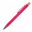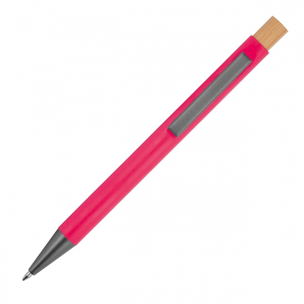 Długopis wykonany z aluminium z recyklingu, bambusowym przyciskiem, metalowym klipsem i wkładem piszącym na niebiesko.