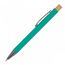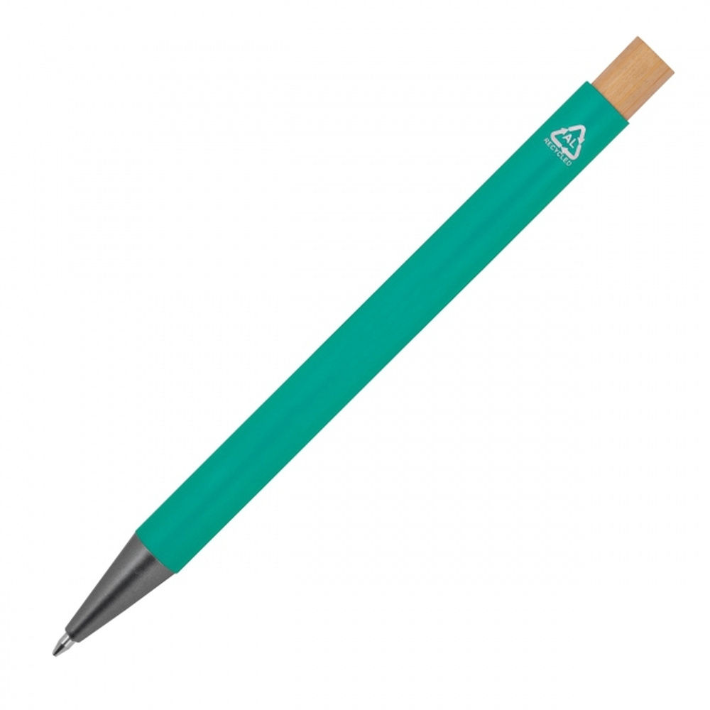 Długopis wykonany z aluminium z recyklingu, bambusowym przyciskiem, metalowym klipsem i wkładem piszącym na niebiesko.