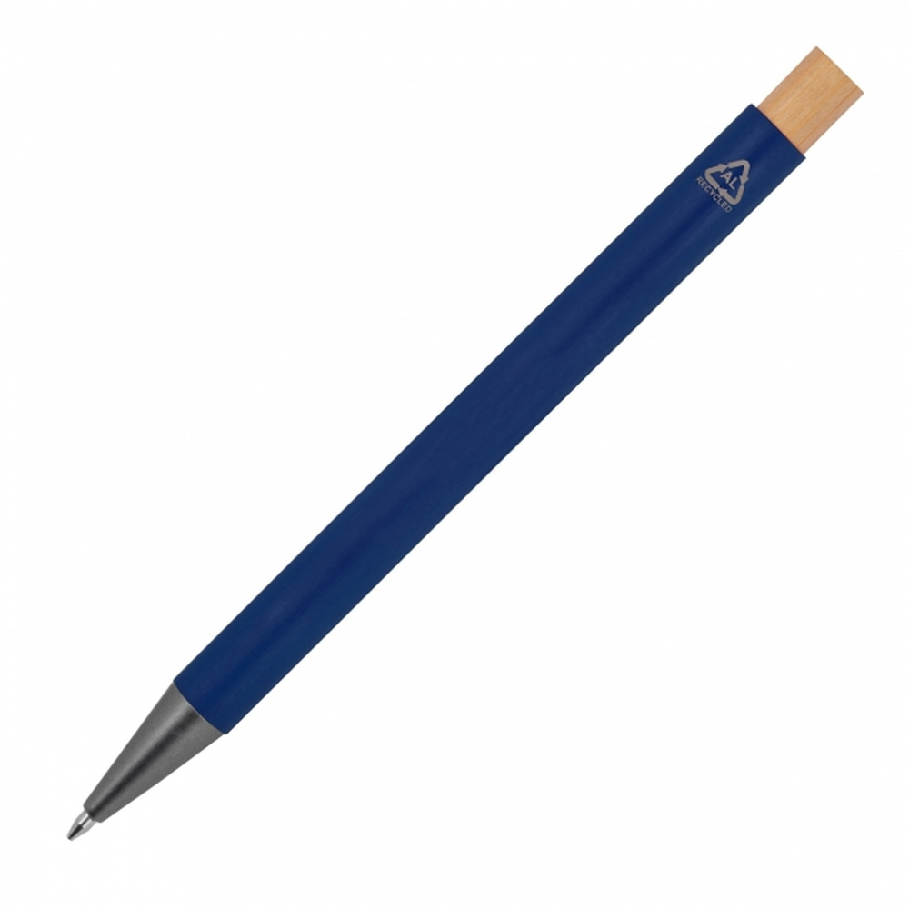 Długopis wykonany z aluminium z recyklingu, bambusowym przyciskiem, metalowym klipsem i wkładem piszącym na niebiesko.