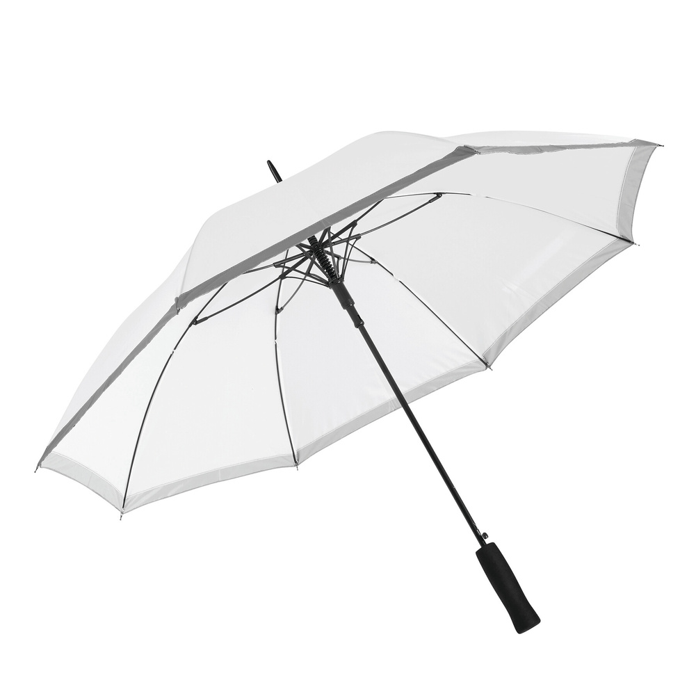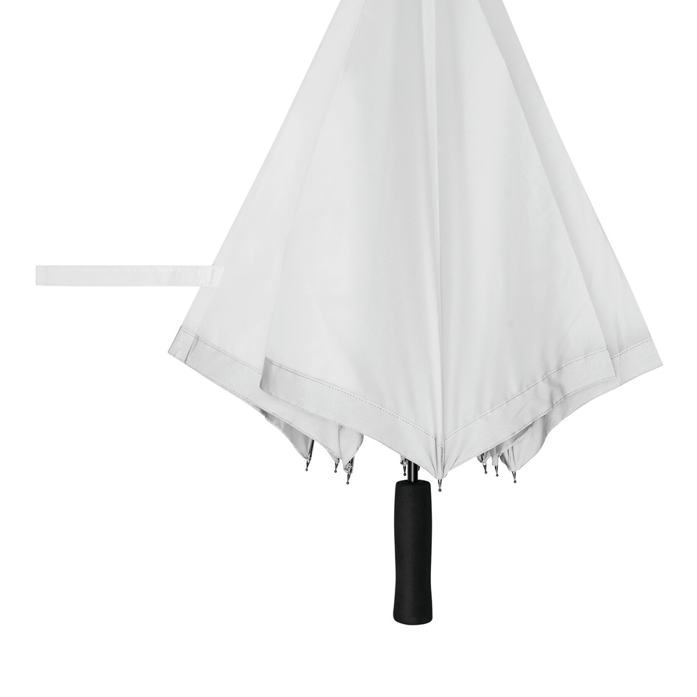 Automatyczny parasol CALIMA. Posiada metalową laskę, szyny z włókna szklanego, metalowe końcówki oraz uchwyt EVA. Czasza wykonana jest z poliestru pongee z tworzywa sztucznego pochodzącego z recyklingu / RPET i posiada srebrny pasek odbijający światło. Zapinany jest na rzep.