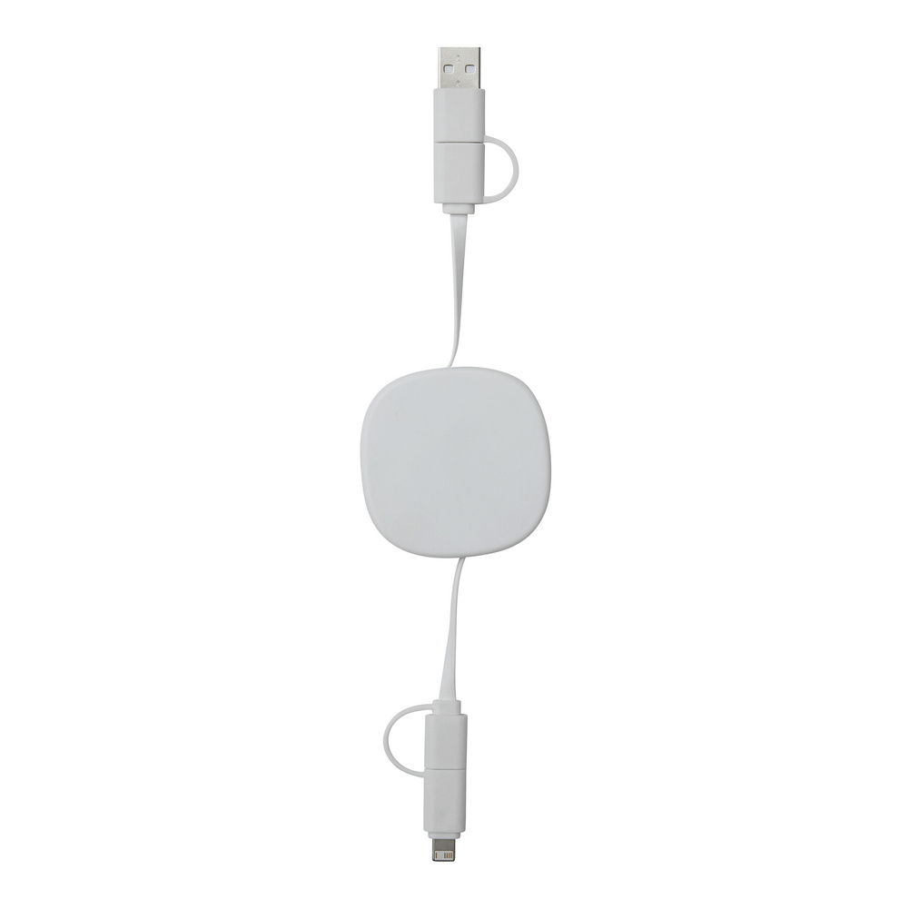 Kabel do ładowania i przesyłania danych TRANSFER SQUAREdo zasilania urządzeń elektronicznych, w tym laptopów (moc 65W). Zwijany kabel ma długość ok. 92 cm. Posiada łączoną wtyczkę wejściową USB-A/USB-C oraz łączoną wtyczkę wyjściową USB-C/Micro USB/Lightning.