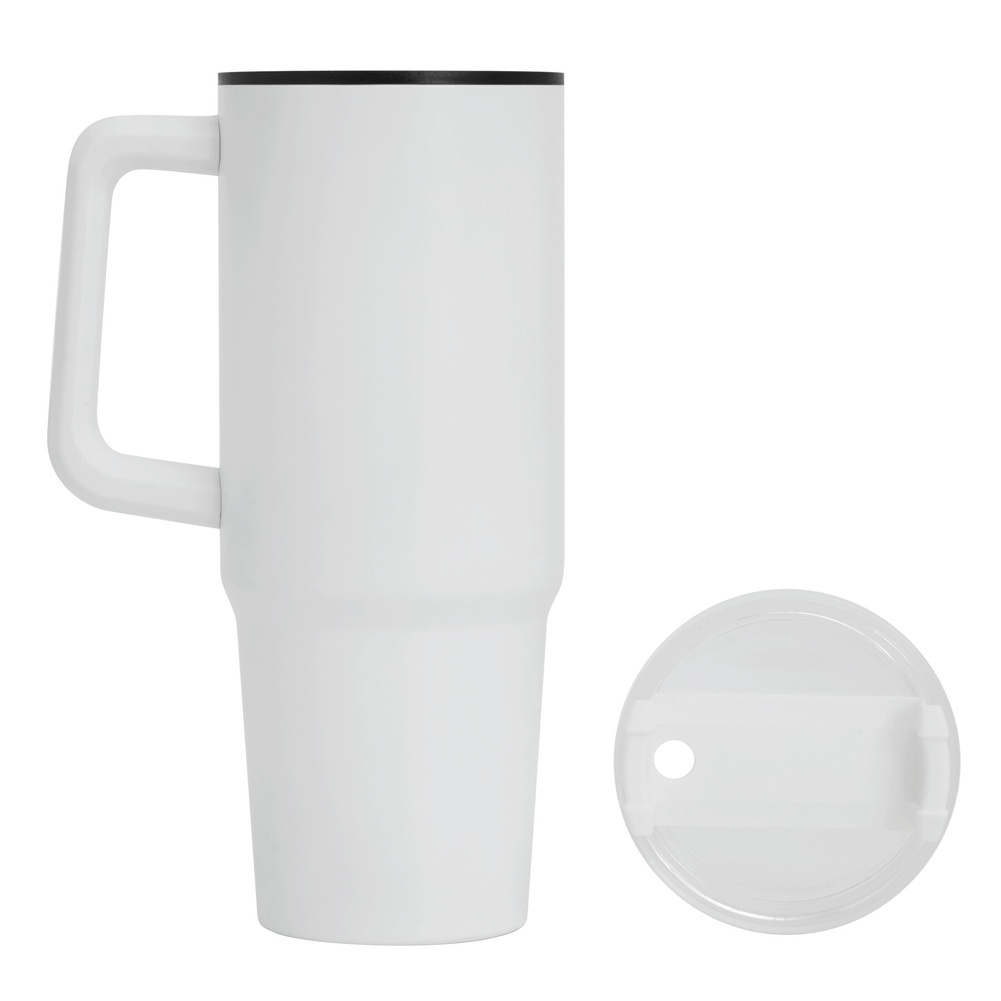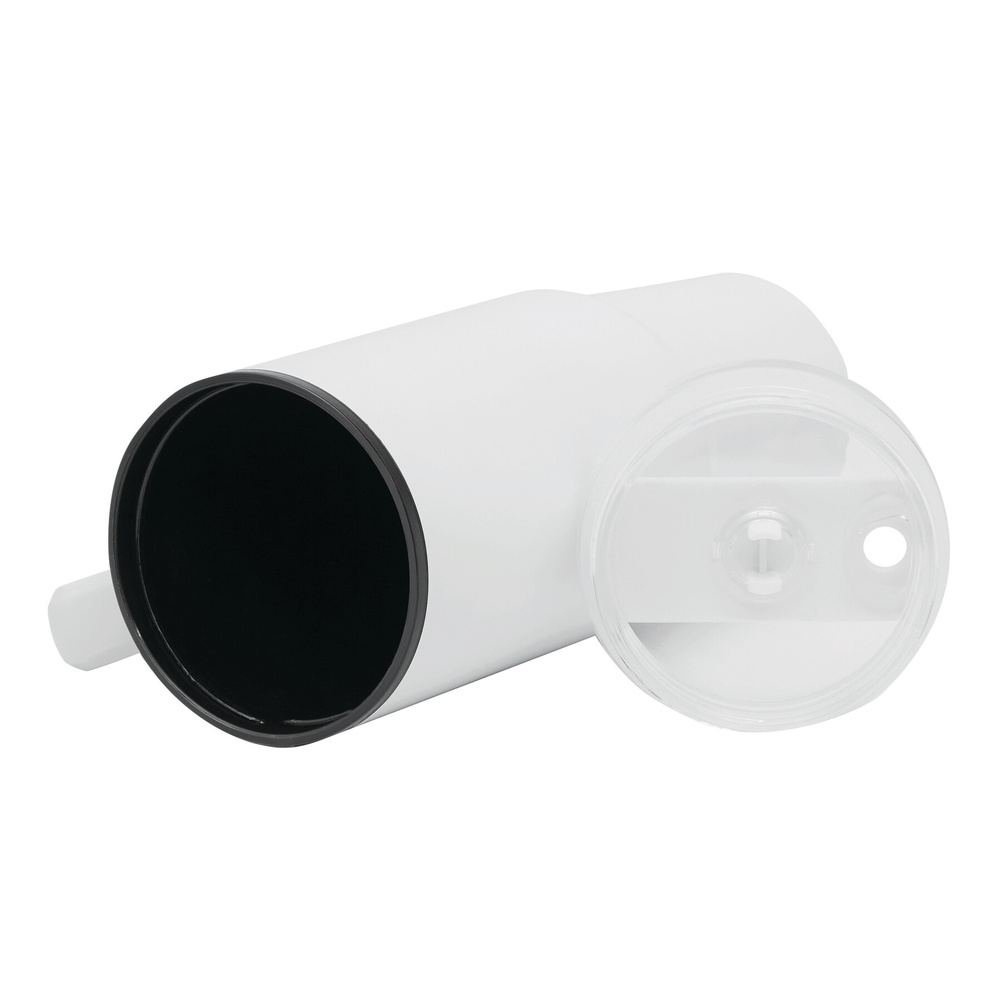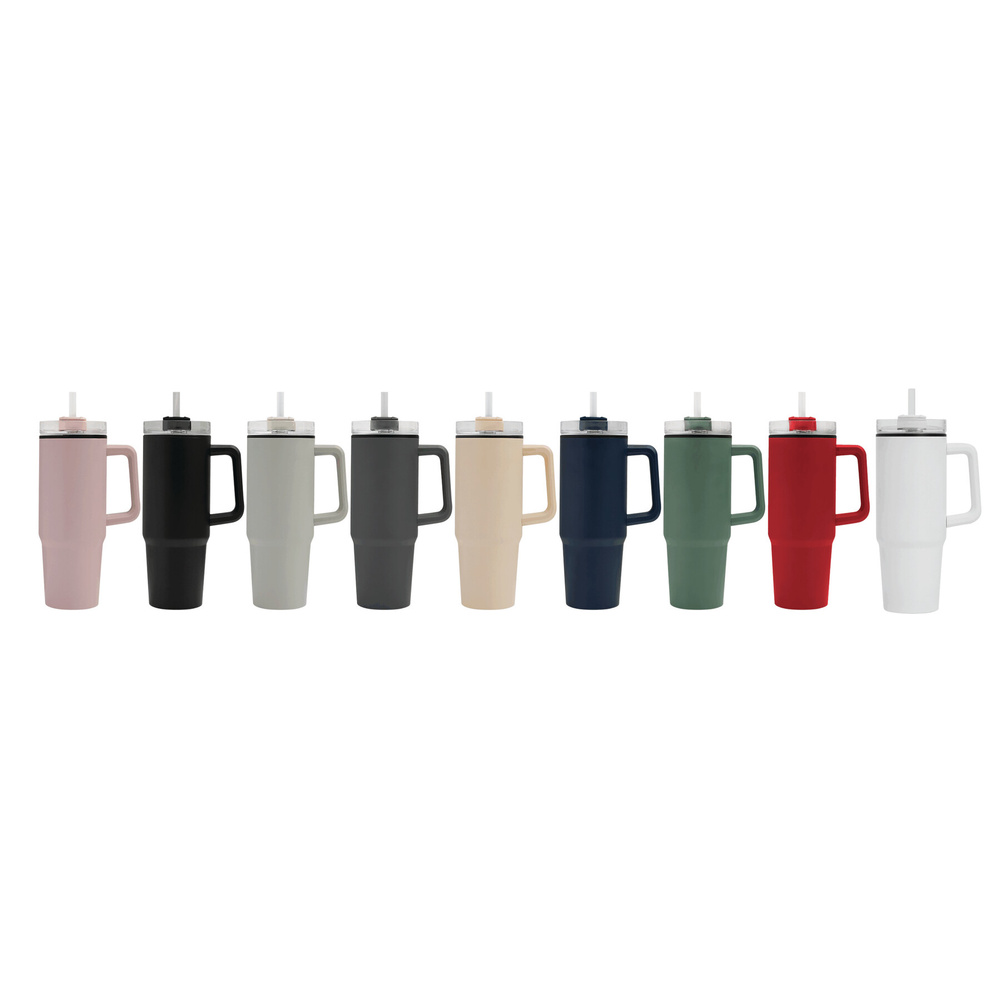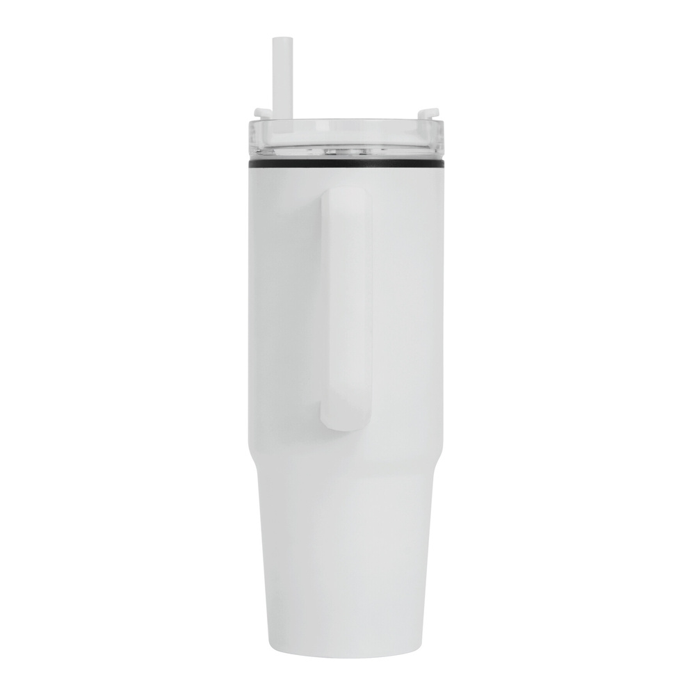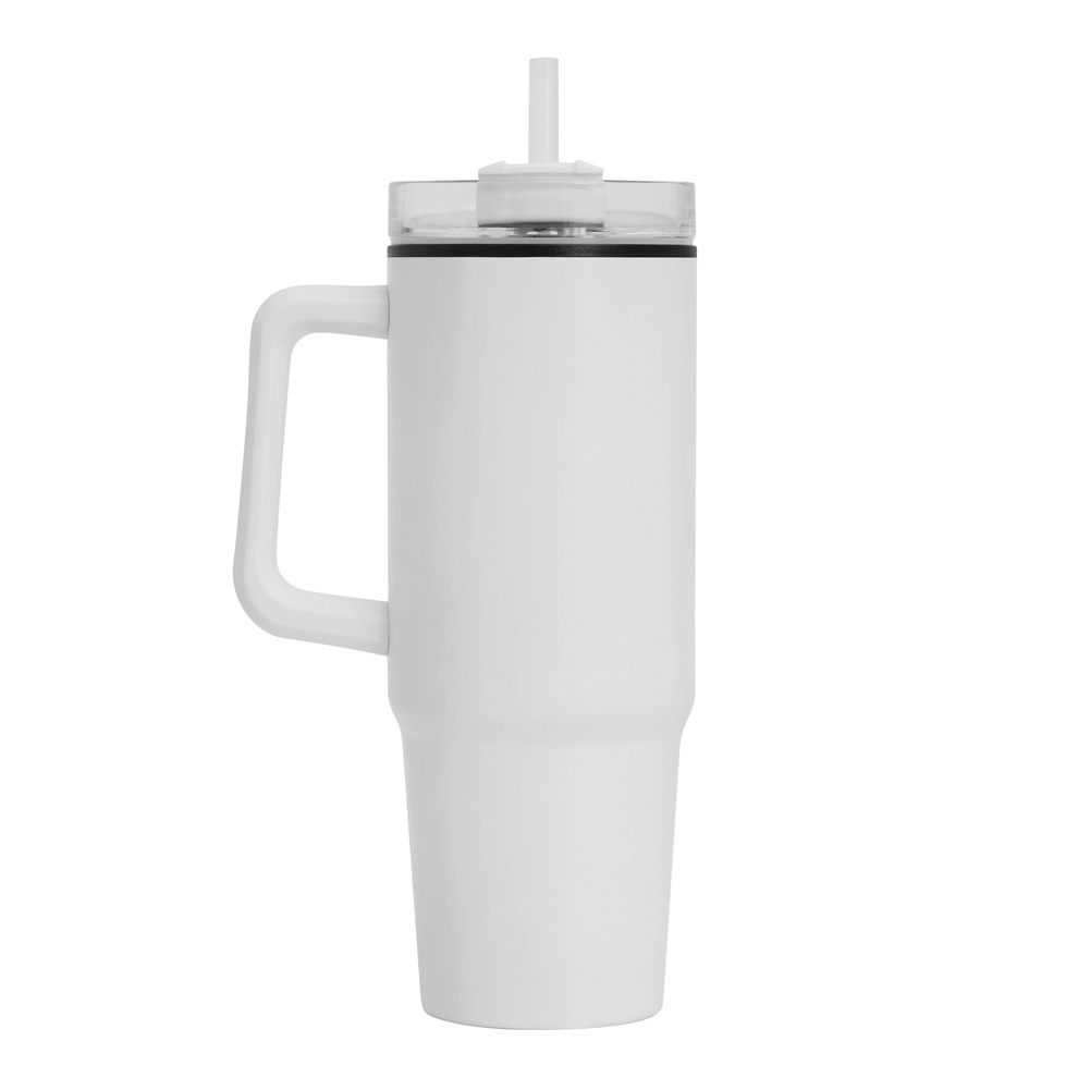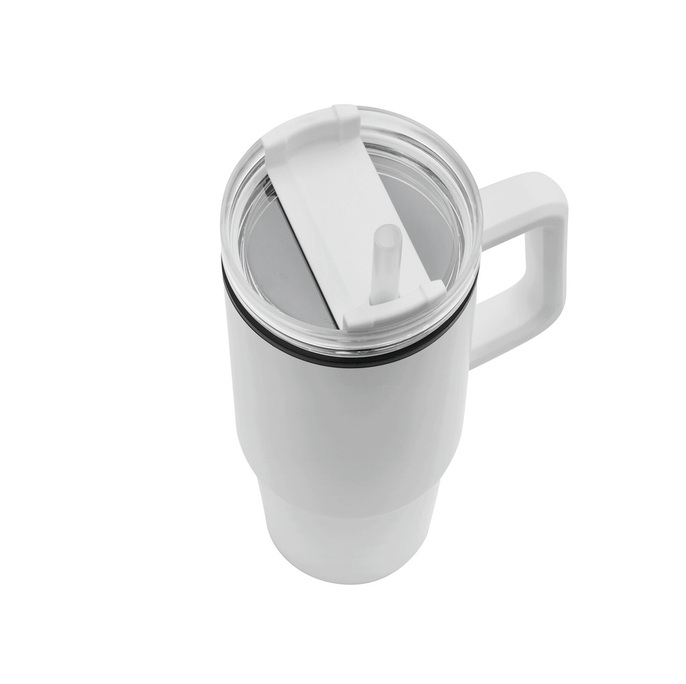 Kubek do picia DRINK ULTY. Z podwójną izolacją – na zewnątrz wykonany jest ze stali nierdzewnej, a wewnątrz z tworzywa sztucznego. Posiada praktyczny uchwyt i szczelną, przezroczystą, plastikową pokrywkę z silikonową uszczelką. Ma zarówno wbudowany otwór do picia, jak i słomkę. Pojemność butelki to ok. 900 ml.