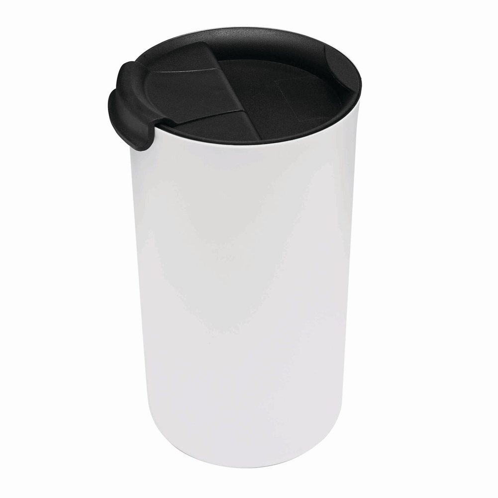 Próżniowy kubek do picia NOBLE, dwuścienny: wewnątrz i na zewnątrz ze stali nierdzewnej, pokrywka z tworzywa sztucznego z silikonową uszczelką i zintegrowanym otworem do picia na zatrzask, pojemność ok. 450 ml, utrzymuje ciepło do 8 godzin i zimno do 12 godzin.