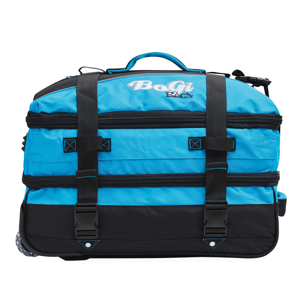 Torba podróżna na kółkach BoGi S: oddzielne poziomy pakowania zapinane na zamek błyskawiczny, komora główna z 2 przegródkami, 1 kieszeń siatkowa zapinana na zamek w jednej z przegród, 2 kieszenie wewnętrzne zapinane na zamek, 2 wyściełane uchwyty, chowany uchwyt wózka, 2 paski kompresyjne z boczną klamrą, okienko adresowe z tyłu, lekkobieżne kółka do jazdy z osłonami narożnymi, 2 szyny ślizgowe chroniące torbę na schodach, nóżki, dołączony zamek szyfrowy.