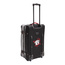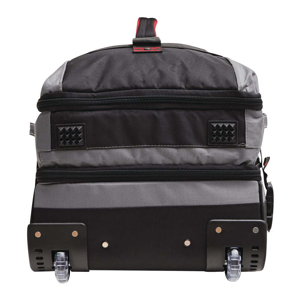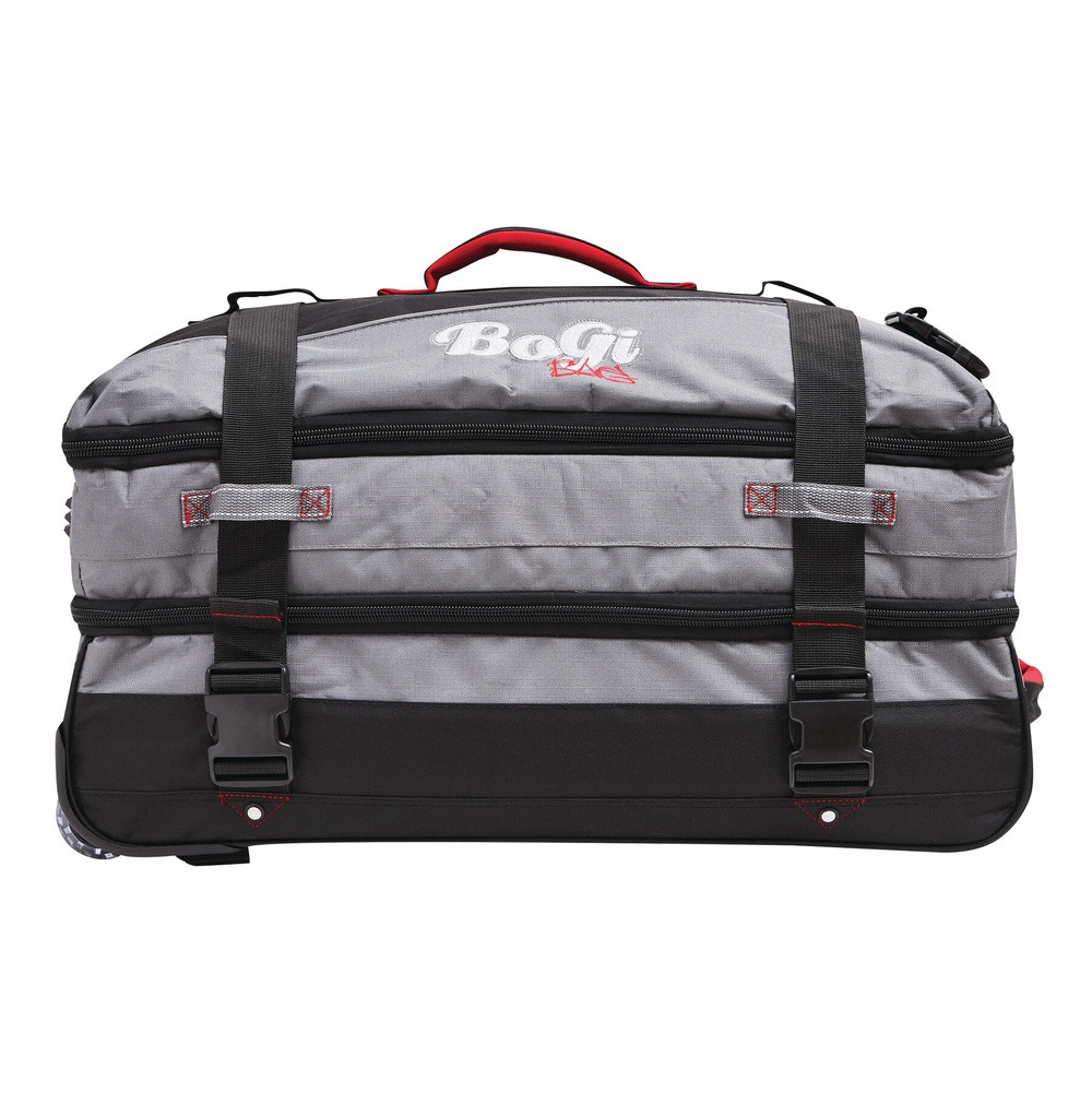Torba podróżna na kółkach BoGi L: oddzielne poziomy pakowania zapinane na zamek błyskawiczny, komora główna z 2 przegródkami, 1 kieszeń siatkowa zapinana na zamek w jednej z przegród, 2 kieszenie wewnętrzne zapinane na zamek, 2 wyściełane uchwyty, chowany uchwyt wózka, 2 paski kompresyjne z boczną klamrą, okienko adresowe z tyłu, lekkobieżne kółka do jazdy z osłonami narożnymi, 2 szyny ślizgowe chroniące torbę na schodach, nóżki, dołączony zamek szyfrowy.