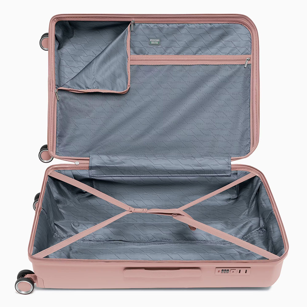 - walizka twarda wykonana z polipropylenu, materiału charakteryzującego się super lekką wagą i niezwykłą wytrzymałością
