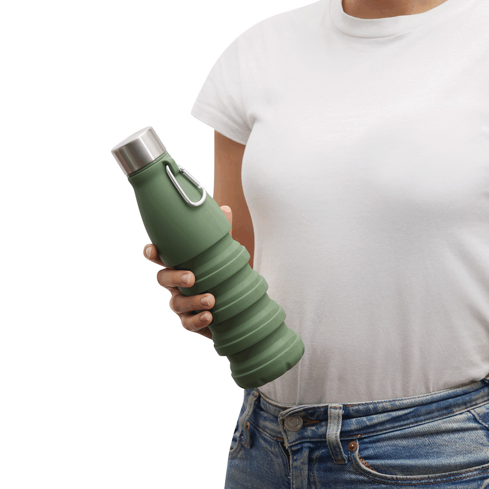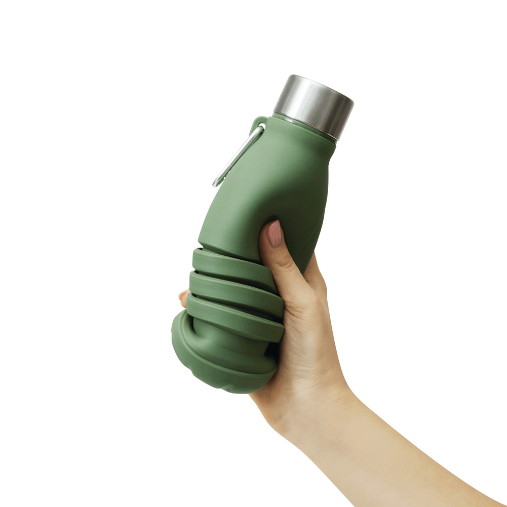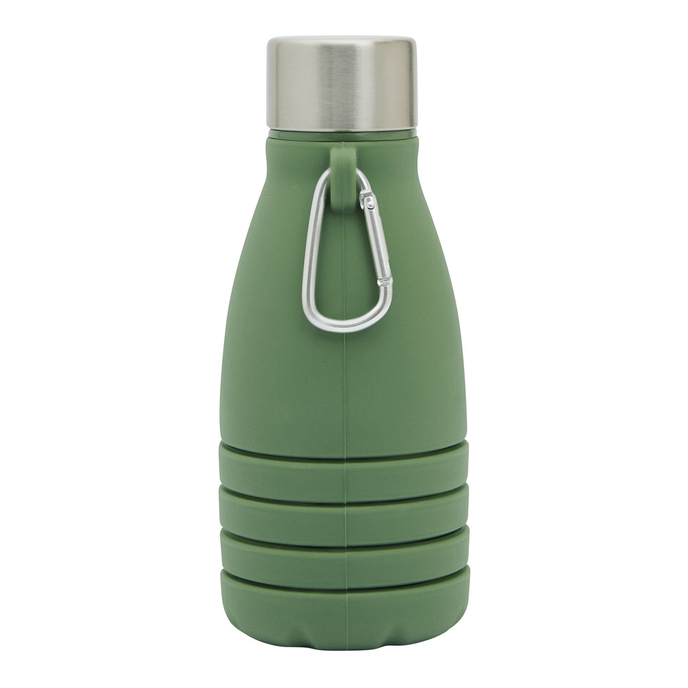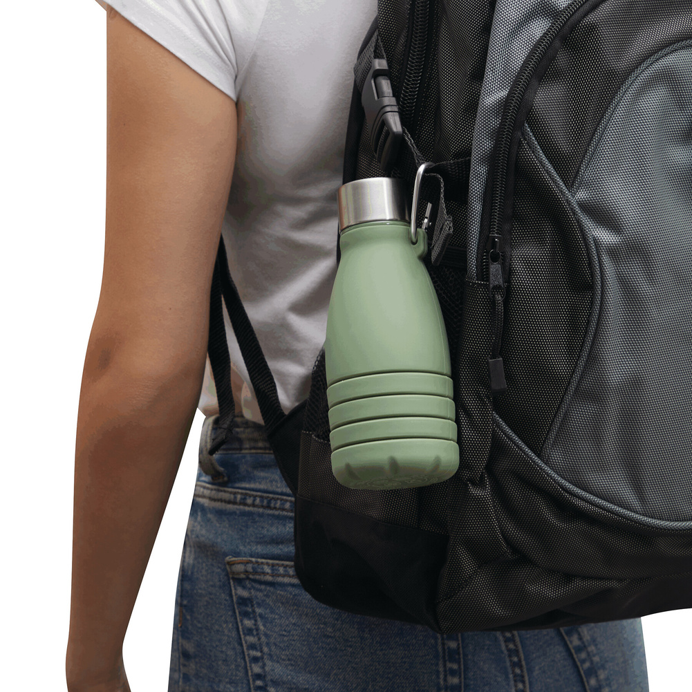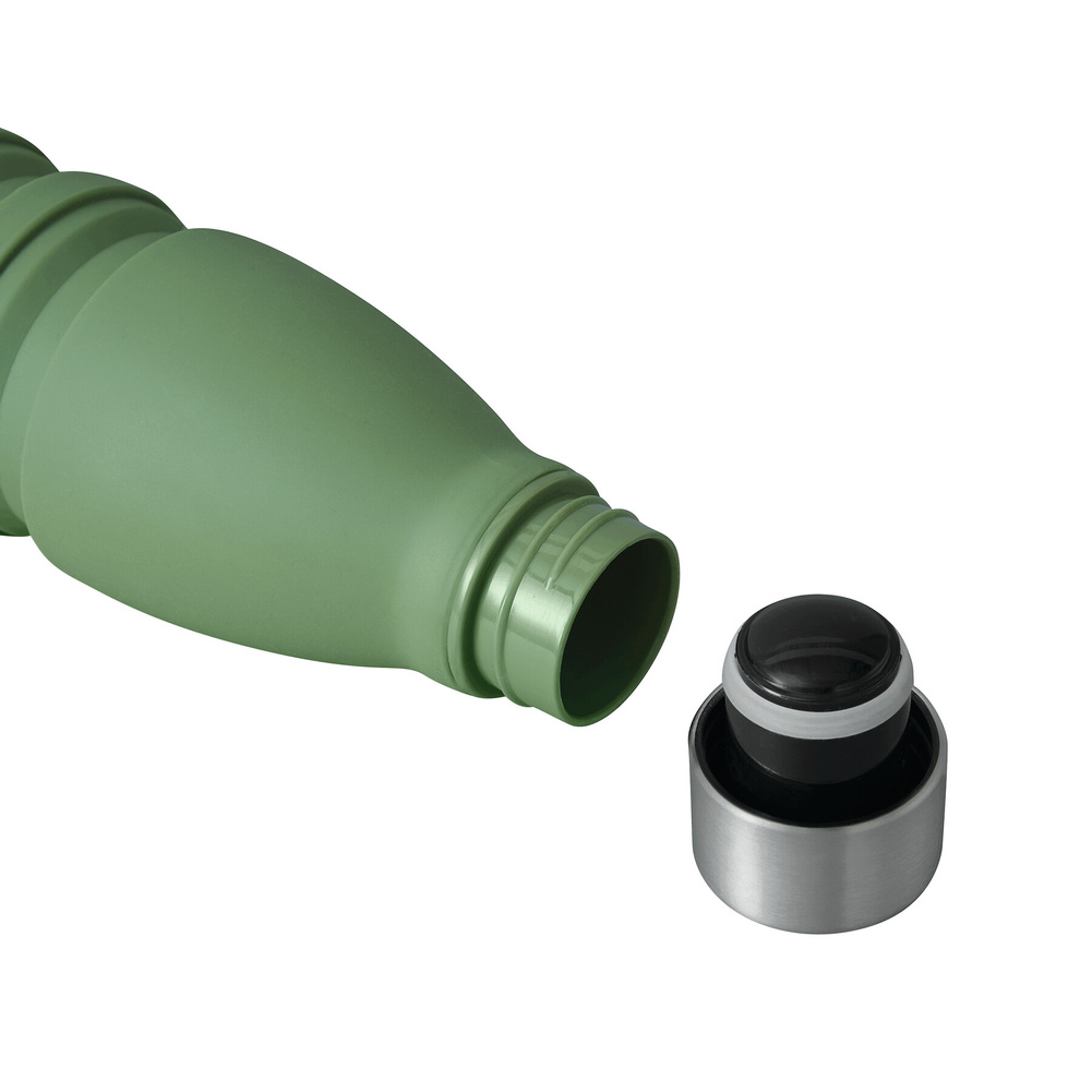 Posiada pokrywkę ze stali nierdzewnej z bezpieczną zakrętką i silikonowym pierścieniem uszczelniającym oraz aluminiowy karabińczyk (NIE nadaje się