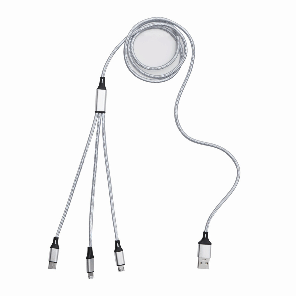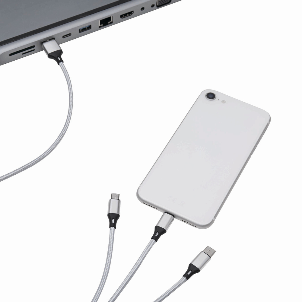 Kabel do ładowania CHARGE DISTANCE: do ładowania urządzeń elektronicznych, zawiera 3 złącza (USB-C, Micro-USB i Lightning), długość ok. 120cm.