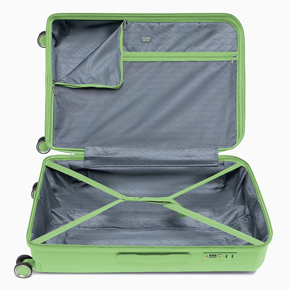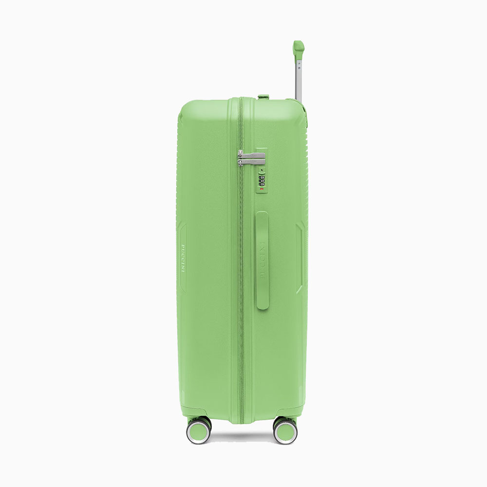 • walizka twarda wykonana z polipropylenu, materiału charakteryzującego się super lekką wagą i niezwykłą wytrzymałością