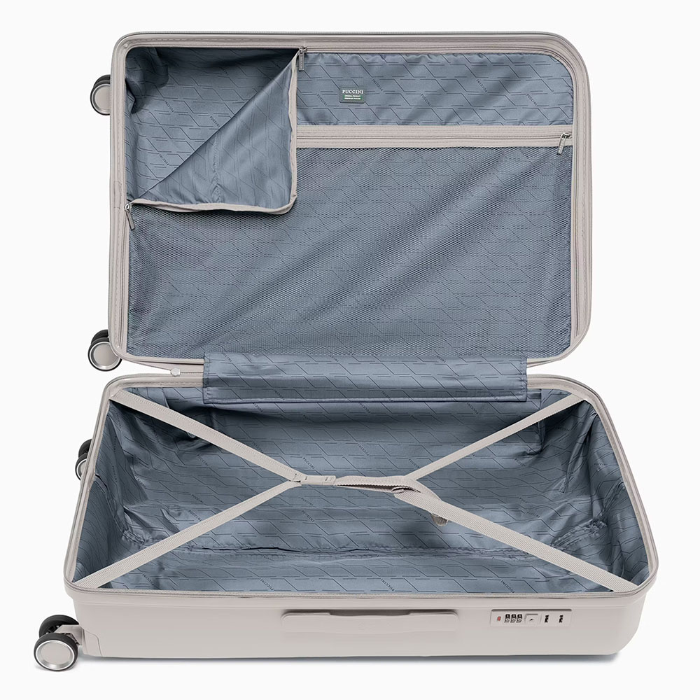 - walizka twarda wykonana z polipropylenu, materiału charakteryzującego się super lekką wagą i niezwykłą wytrzymałością