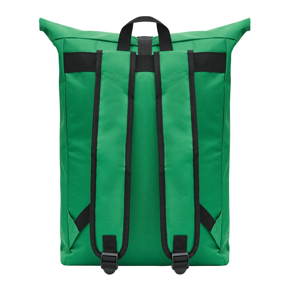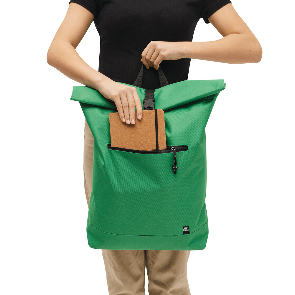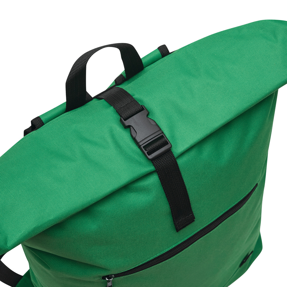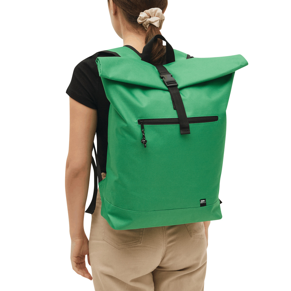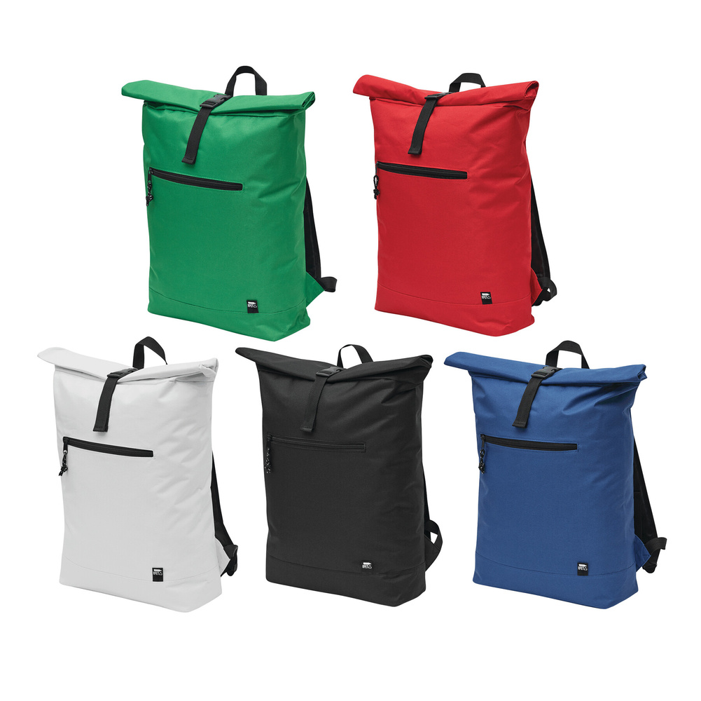 Plecak ROLL-TOP wykonany jest z tworzywa sztucznego pochodzącego z recyklingu (RPET). Posiada poziomą komorę przednią zapinaną na zamek błyskawiczny oraz dużą komorę główną z wyściełaną przegrodą wewnętrzną na laptopa lub tablet. Plecak można zwiniąć i zamknąć na zatrzask. Ma wygodny pasek do przenoszenia oraz wyściełaną podstawę, szelki i plecy.