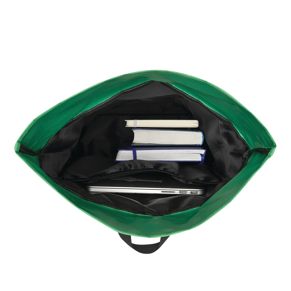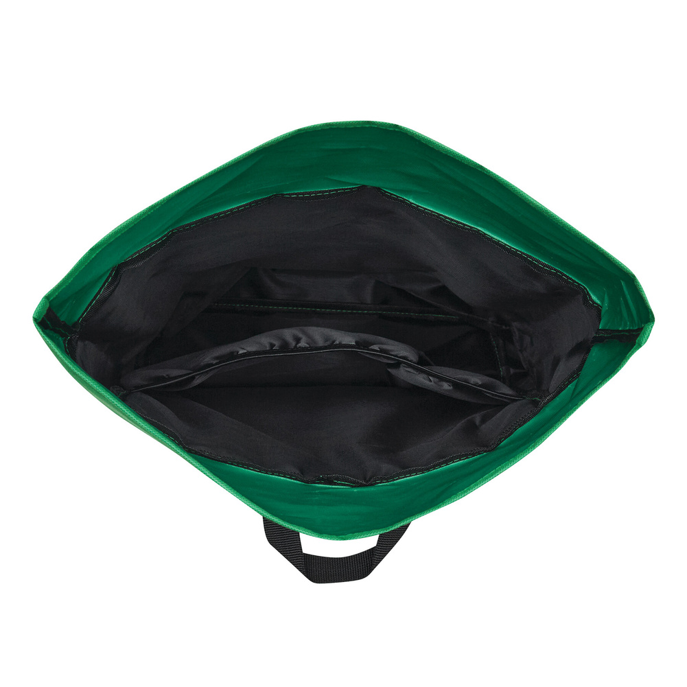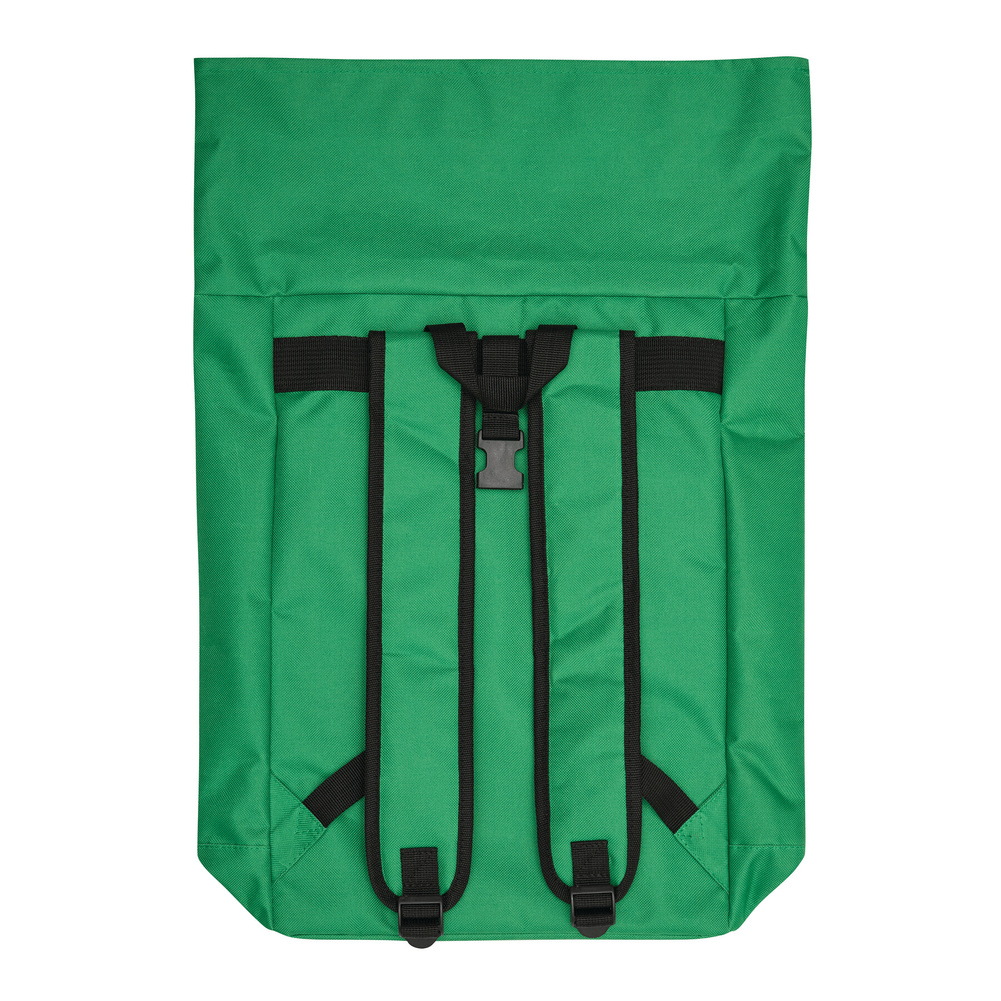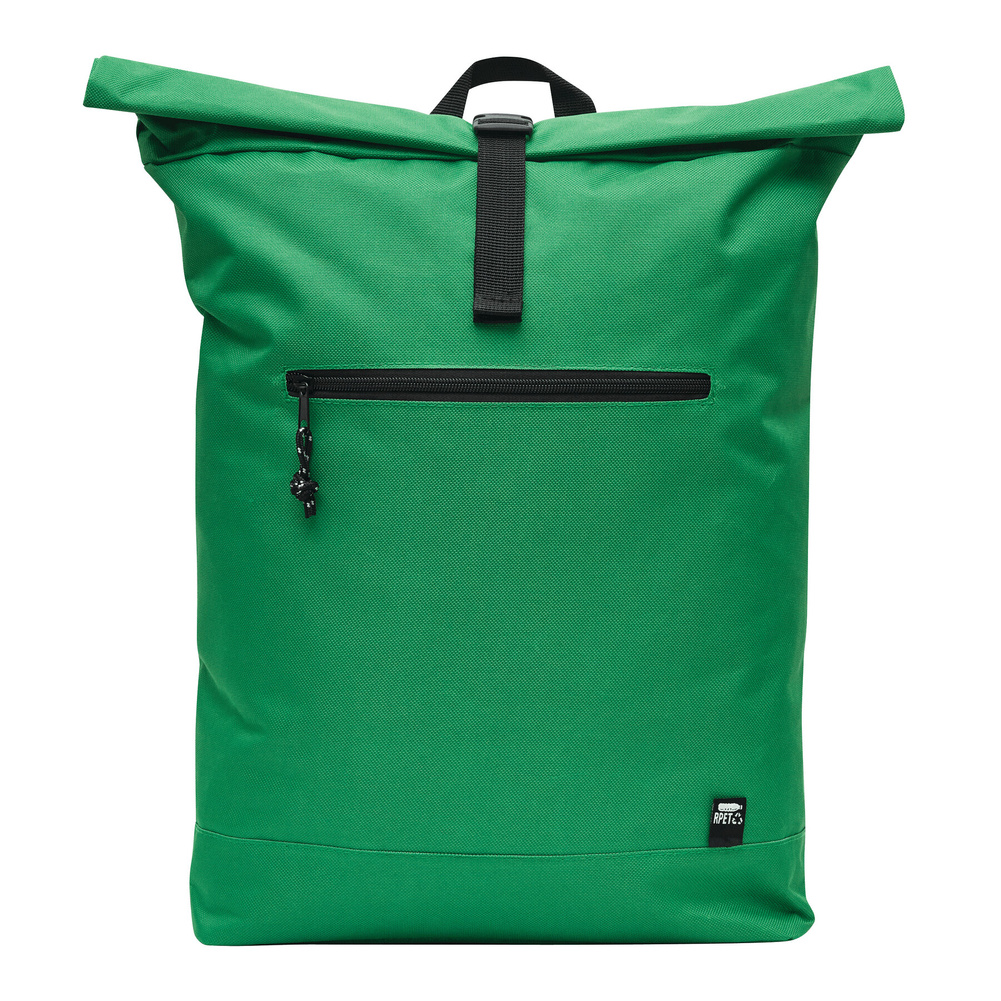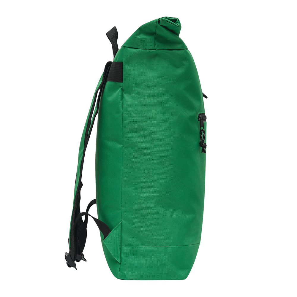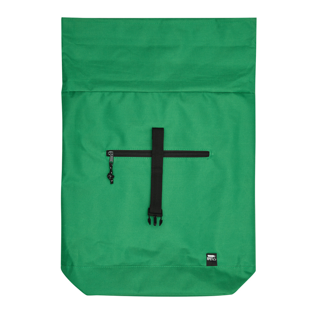 Plecak ROLL-TOP wykonany jest z tworzywa sztucznego pochodzącego z recyklingu (RPET). Posiada poziomą komorę przednią zapinaną na zamek błyskawiczny oraz dużą komorę główną z wyściełaną przegrodą wewnętrzną na laptopa lub tablet. Plecak można zwiniąć i zamknąć na zatrzask. Ma wygodny pasek do przenoszenia oraz wyściełaną podstawę, szelki i plecy.