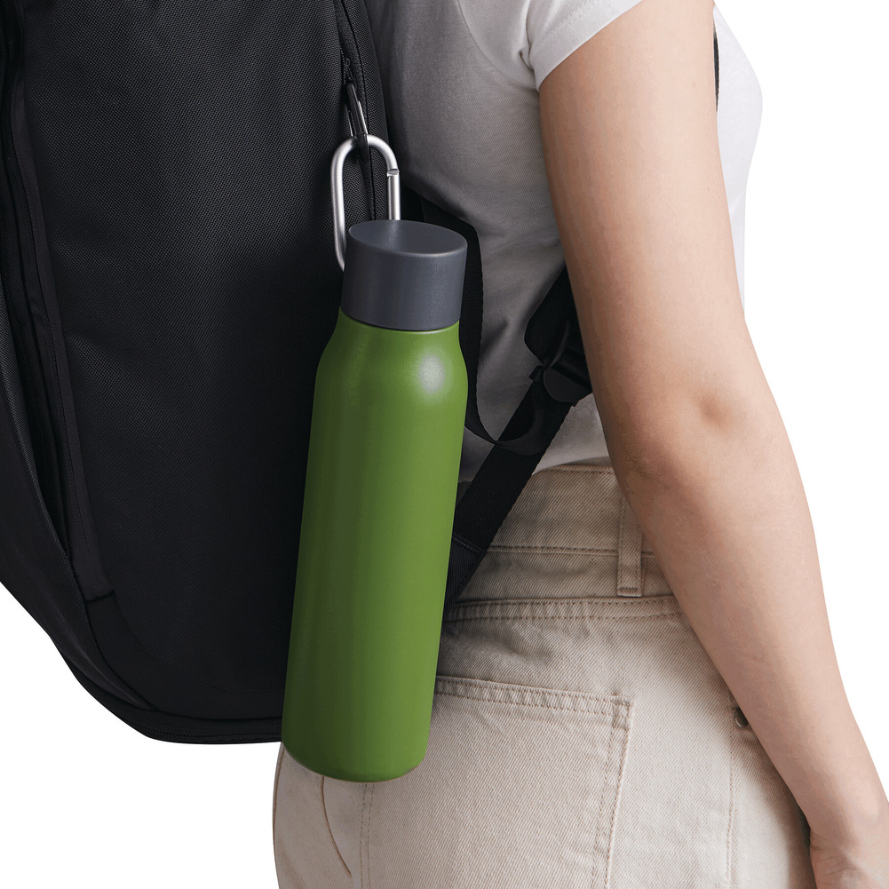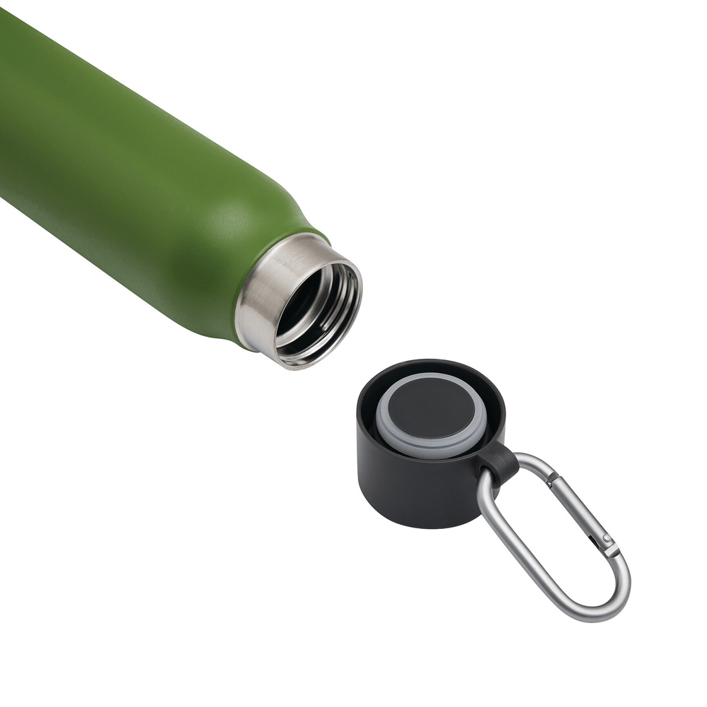 Posiada plastikową pokrywkę z bezpieczną zakrętką, silikonowy pierścień uszczelniający i karabińczyk (karabińczyk NIE nadaje się do wspinaczki).