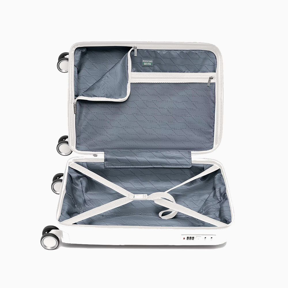 • walizka twarda wykonana z polipropylenu, materiału charakteryzującego się super lekką wagą i niezwykłą wytrzymałością