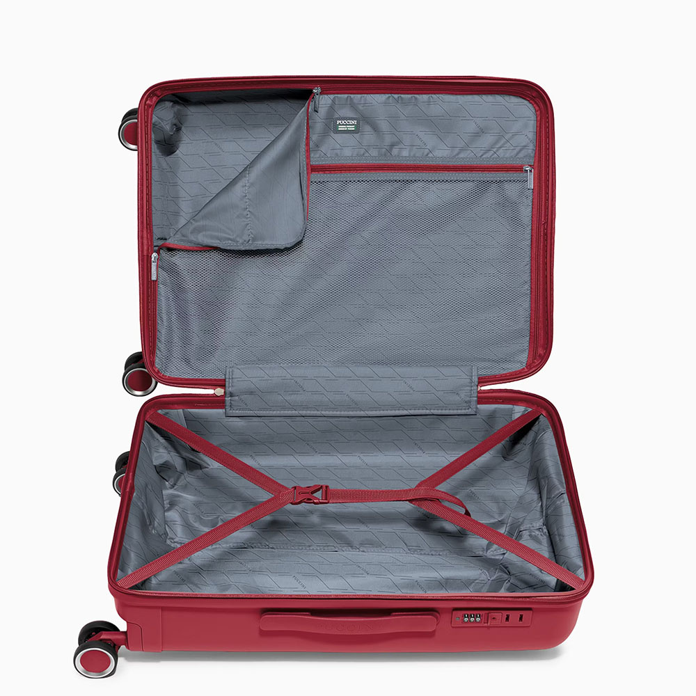 - walizka twarda wykonana z polipropylenu, materiału charakteryzującego się super lekką wagą i niezwykłą wytrzymałością