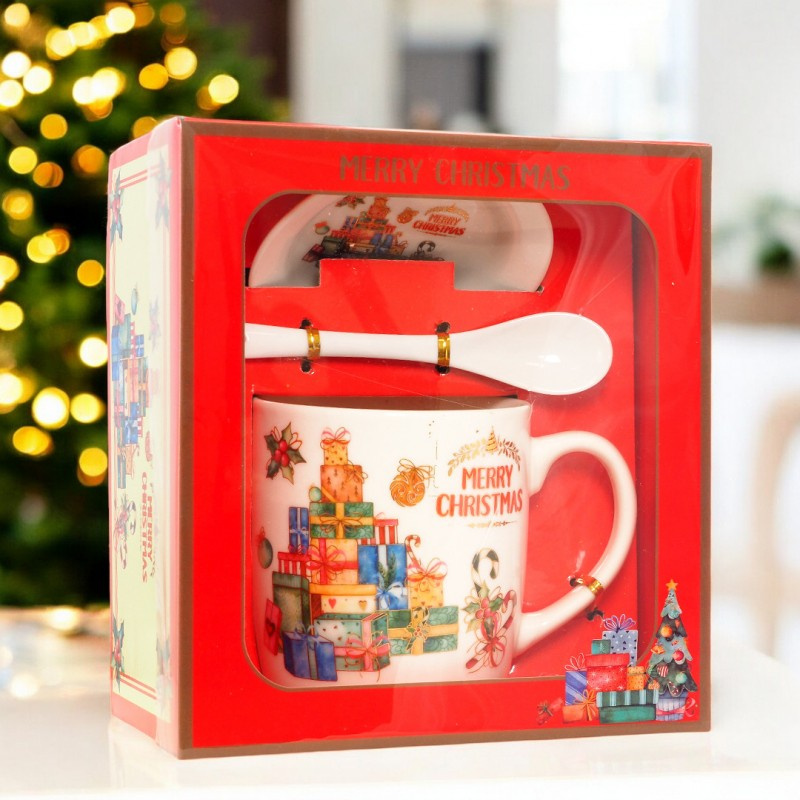 KUBEK CERAMICZNY CZERWONY z motywem świątecznym Zestaw z pokrywką i łyżeczką Idealny gadżet dla każdego miłośnika kawy czy herbaty.