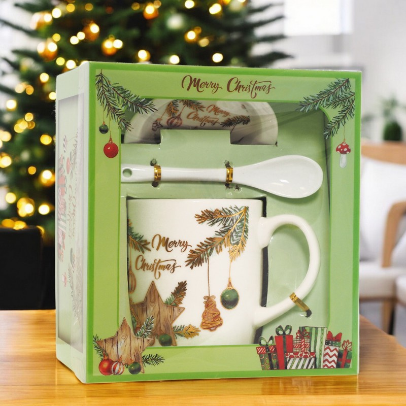 KUBEK CERAMICZNY z motywem świątecznym Zestaw z pokrywką i łyżeczką Idealny gadżet dla każdego miłośnika kawy czy herbaty.