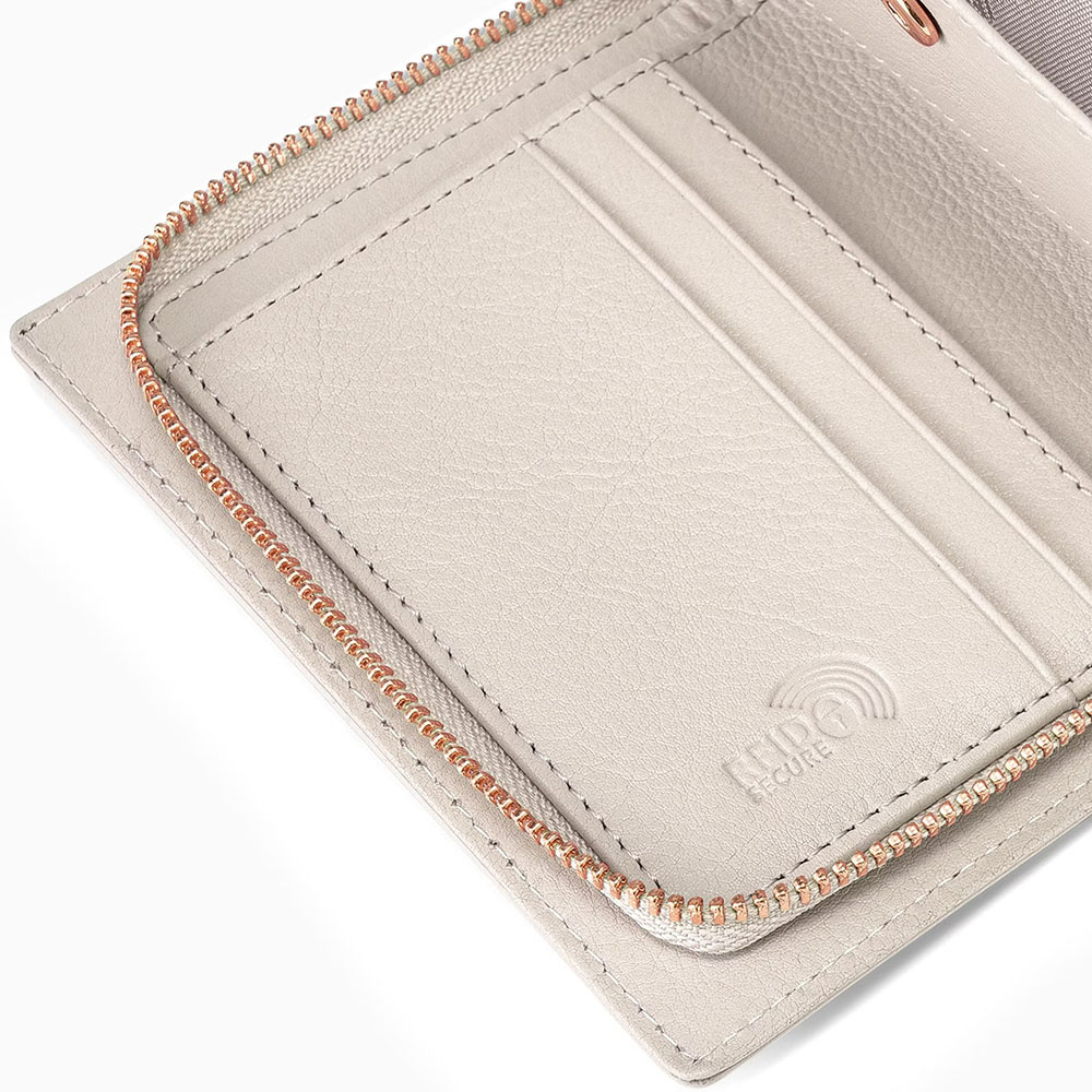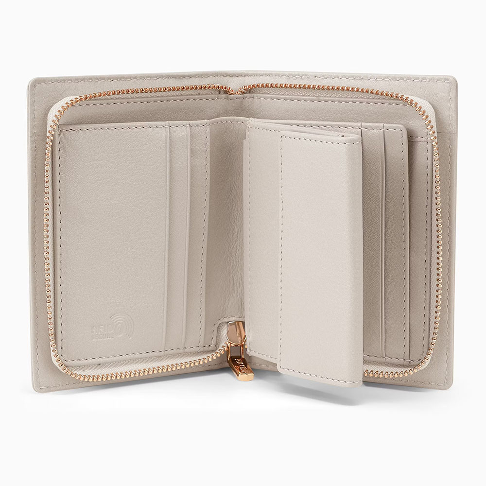 Dzięki średniemu rozmiarowi portfel doskonale mieści się w dłoni i w torebce, zapewniając pełen komfort użytkowania. Wnętrze zaprojektowano tak, by pomieściło wszystko, co najważniejsze – miejsce na banknoty, sześć przegródek na karty lub wizytówki oraz kieszonkę na bilon zapinaną na zatrzask. Całość zabezpieczono praktycznym zamkiem, który chroni zawartość przed wypadnięciem.
