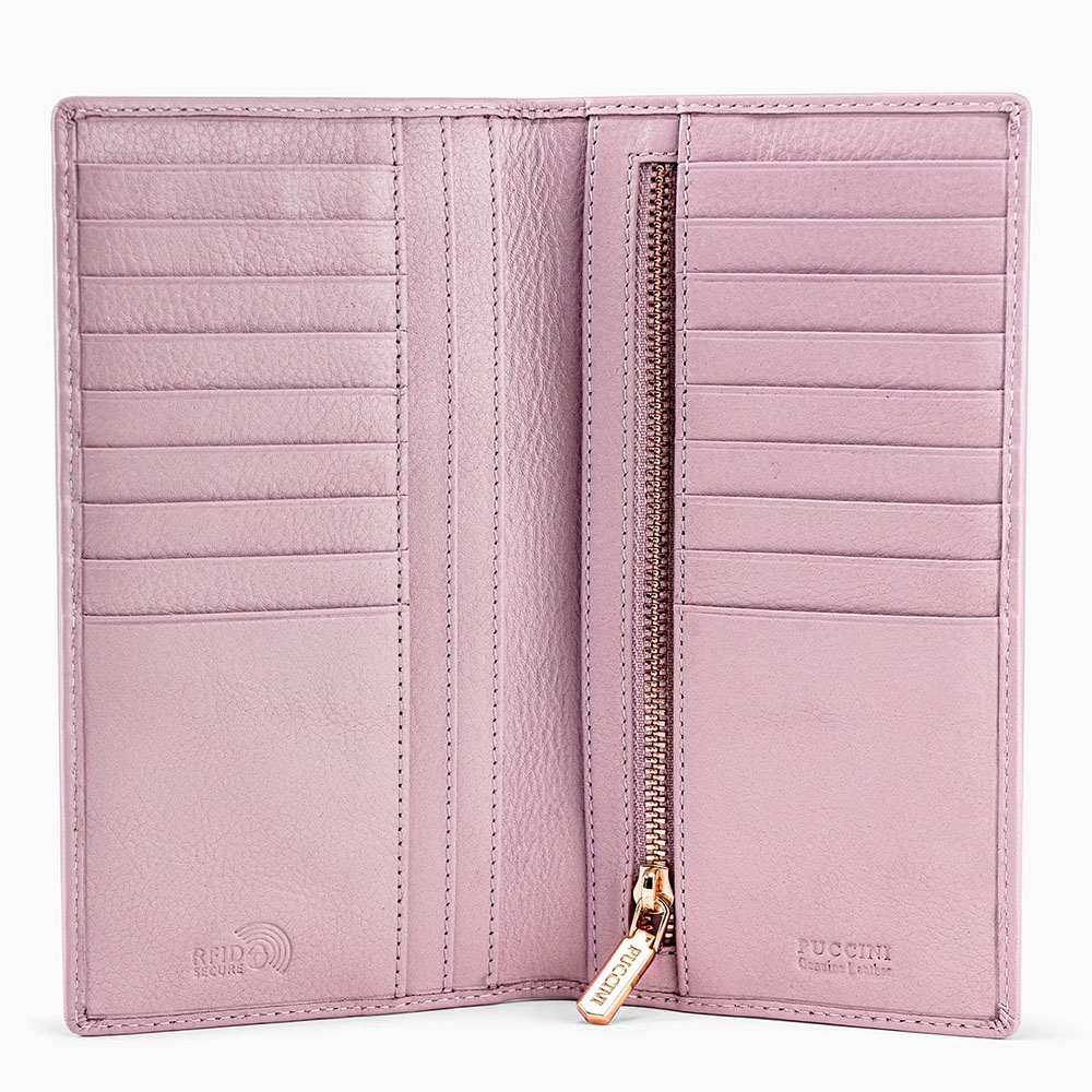 Dzięki pionowej orientacji, portfel wygodnie leży w dłoni, zapewniając pełen komfort użytkowania. Wewnątrz znajduje się aż 18 przegródek na karty lub wizytówki oraz 4 duże przegrody, idealne na banknoty, paragony lub większe dokumenty. Dodatkowo, wewnętrzna kieszonka na bilon zapinana na zamek gwarantuje bezpieczne przechowywanie monet i drobiazgów.