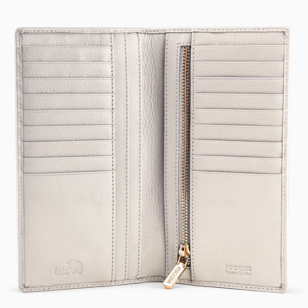 Dzięki pionowej orientacji, portfel wygodnie leży w dłoni, zapewniając pełen komfort użytkowania. Wewnątrz znajduje się aż 18 przegródek na karty lub wizytówki oraz 4 duże przegrody, idealne na banknoty, paragony lub większe dokumenty. Dodatkowo, wewnętrzna kieszonka na bilon zapinana na zamek gwarantuje bezpieczne przechowywanie monet i drobiazgów.