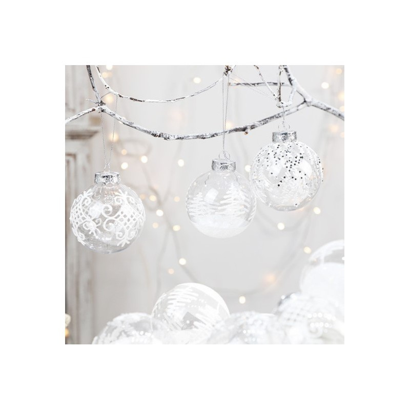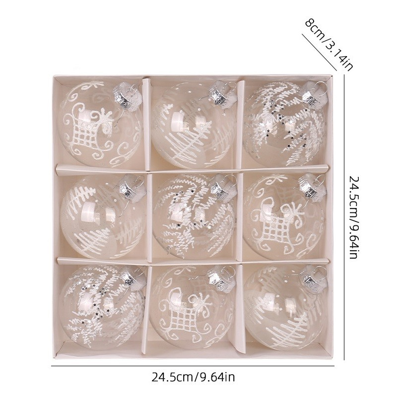 Specyfikacja:  Zestaw 9 sztuk  Średnica bombki: 8 cm  Kolor: Biały Materiał: tworzywo sztuczne Wymiary opakowania: 24,5 x 24,5 x 8 cm