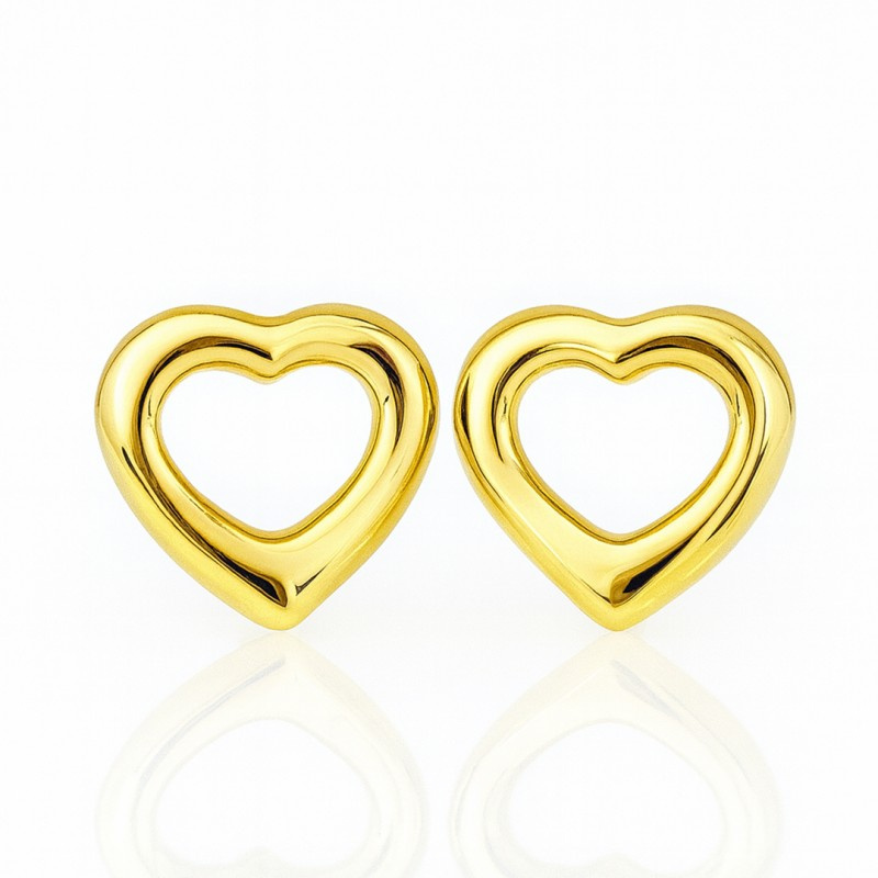 Wymiar kolczyków: 1,8cm x 2,2 cm Wymiar kartonika:5,5 cm x 6 cm Waga:3g netto Kolor: jasne złoto Rodzaj zapięcia: sztyft STAL CHIRURGICZNA jest odporna na