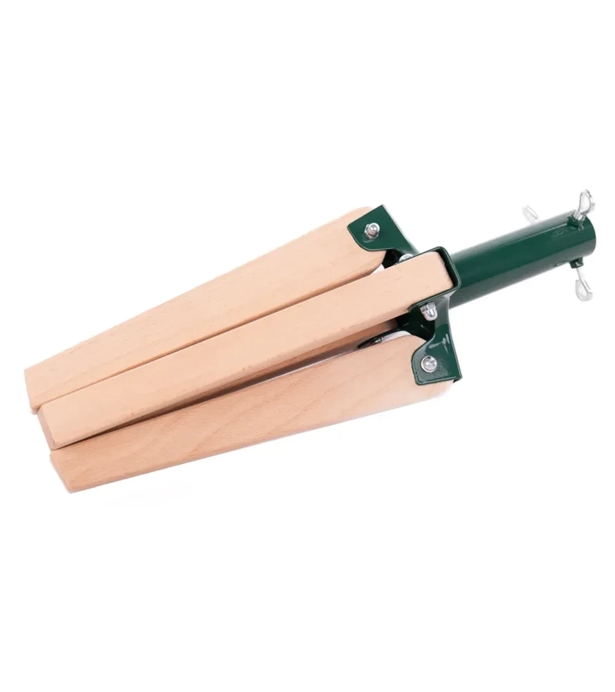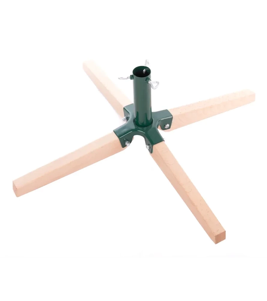 Stojak został zaprojektowany z myślą o trwałości i estetyce. Cztery rozkładane ramiona z jasnego drewna zapewniają szeroką i stabilną podstawę, minimalizując ryzyko przewrócenia. Centralny element – tuleja na pień wykonana z metalu w kolorze zielonym – jest odporny na uszkodzenia i doskonale komponuje się ze sztuczną choinką.