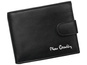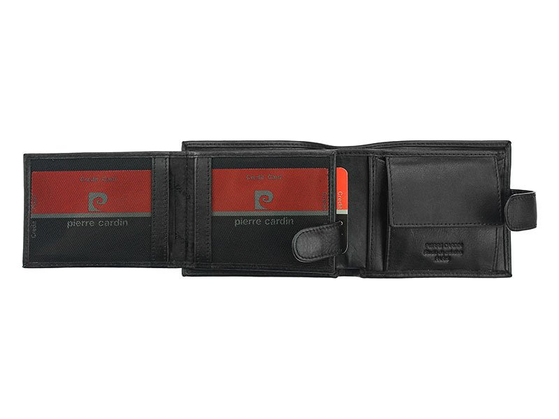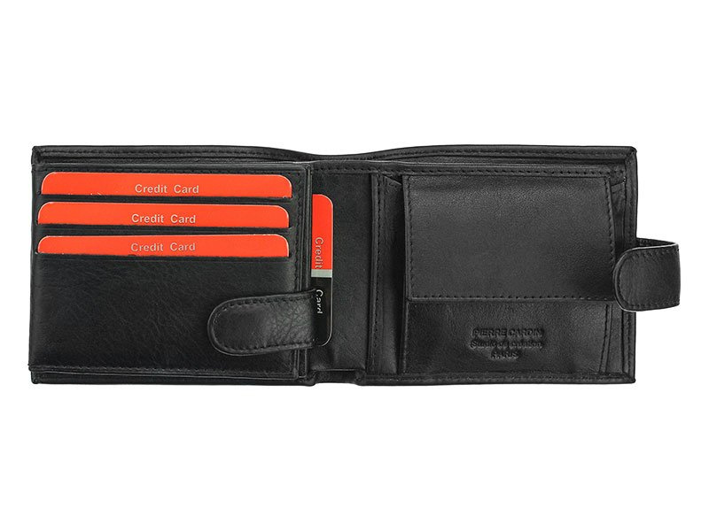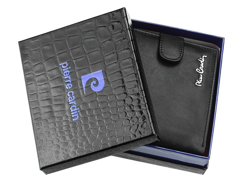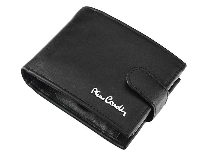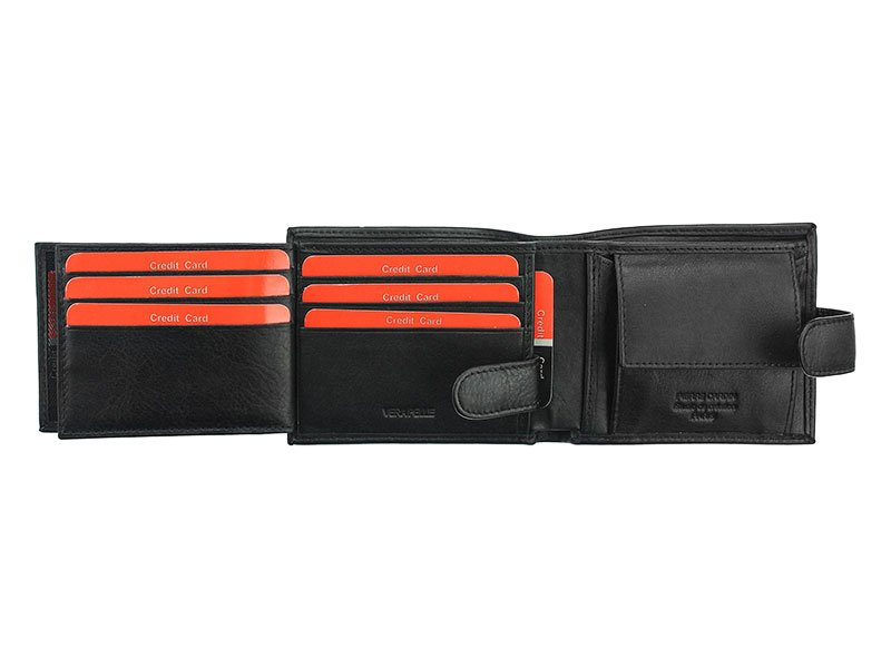 Nieduży portfel męski, wykonany z najwyższej jakości, naturalnej włoskiej skóry licowej. Budowa portfela: - orientacja pozioma, - dwie przegrody na banknoty, - dziewięć przegródek na karty magnetyczne, - dwa "okienka" na zdjęcie, - kieszeń na drobne, zamykana na zatrzask, - całość zamykana patką z zatrzaskiem, - na froncie portfela umieszczono metalowe logo producenta. Portfel dostarczany jest w oryginalnym pudełku - doskonale nadaje się na prezent.