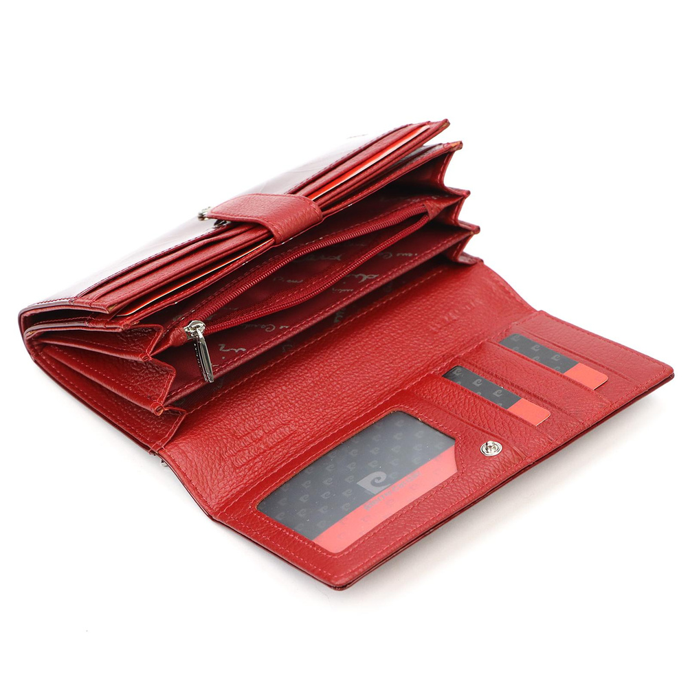 Duży portfel damski, wykonany z najwyższej jakości naturalnej, włoskiej skóry licowej lakierowanej, z wytłoczonym, delikatnym motywem liści. Budowa portfela: - orientacja pozioma, - trzy przegrody na banknoty, - dwanaście przegródek na karty magnetyczne, - trzy "okienka" na zdjęcie, - kieszonka na drobne, zamykana na suwak, - całość zamykana klapą z zatrzaskiem, - na tylnej ściance portfela wszyto jeszcze jedną kieszonkę, zapinaną na zamek błyskawiczny. Portfel dostarczany jest w oryginalnym, firmowym pudełku - idealny na prezent.