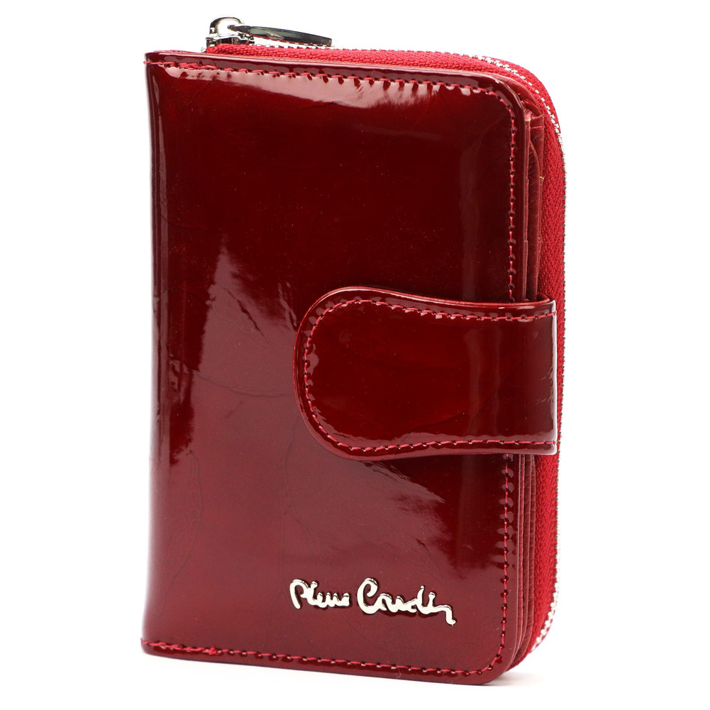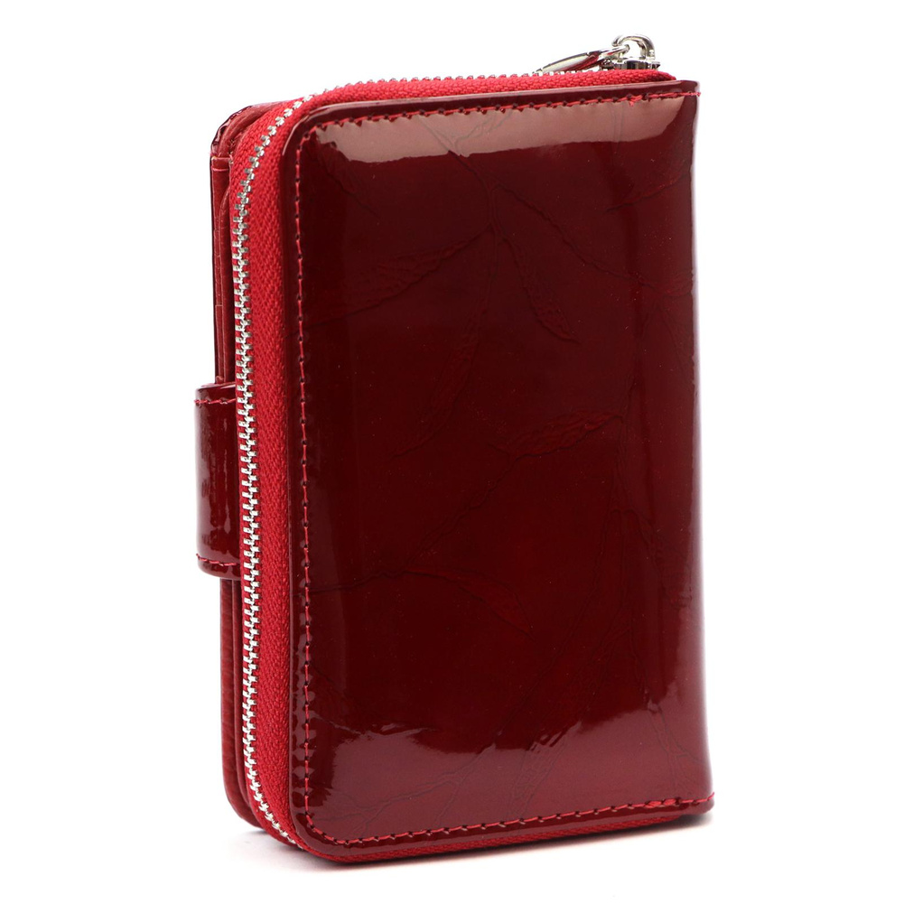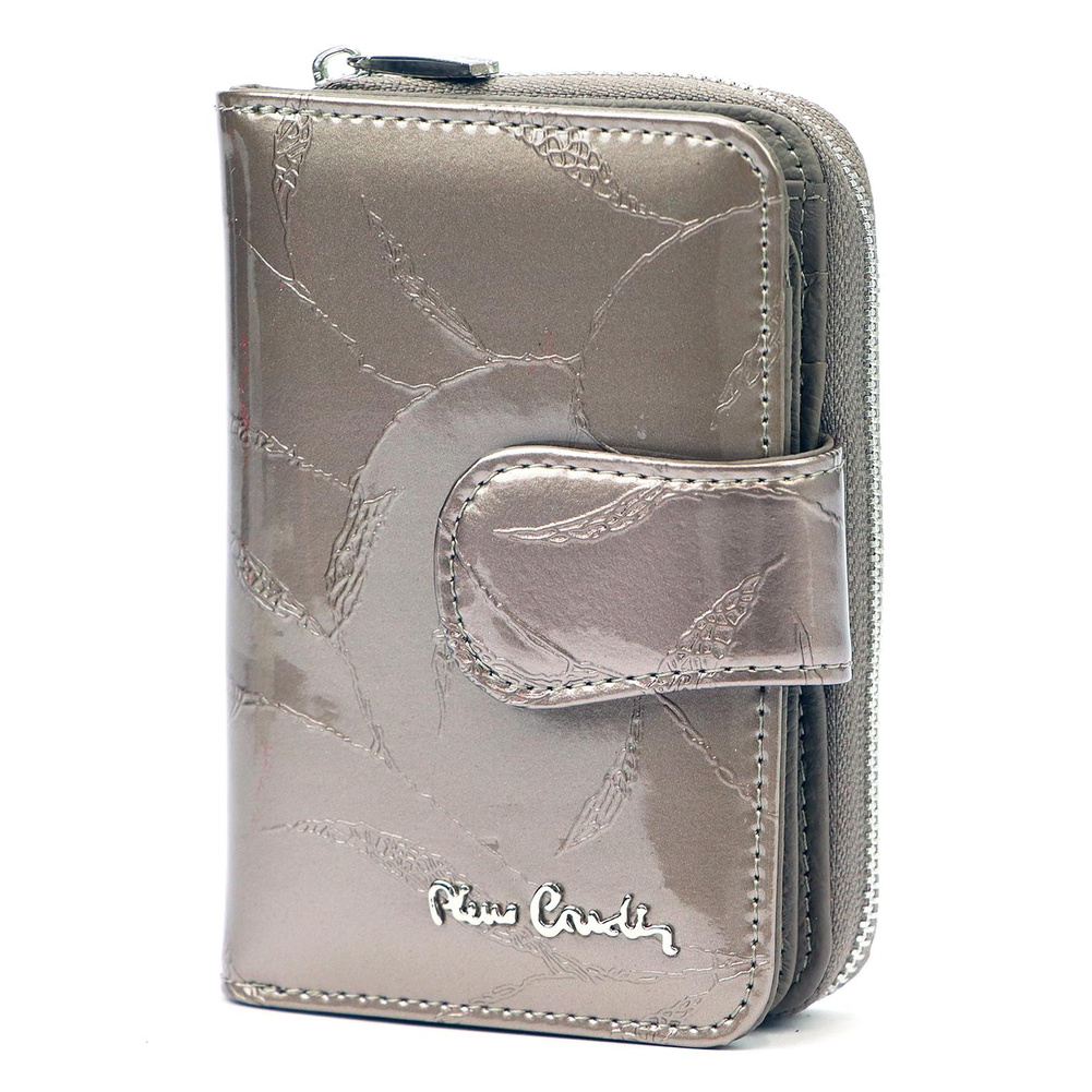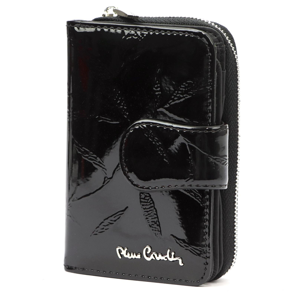 Nieduży portfel damski, wykonany z najwyższej jakości naturalnej, włoskiej skóry licowej lakierowanej, z wytłoczonym, delikatnym motywem liści. Budowa portfela: - orientacja pionowa, - przegródka na banknoty, - osiem przegródek na karty magnetyczne, - dwa "okienka" na zdjęcie, - kieszeń na drobne, podzielona na dwie części, zamykana na zamek błyskawiczny, - całość zamykana patką z zatrzaskiem. Portfel dostarczany jest w oryginalnym, firmowym pudełku - idealny na prezent.