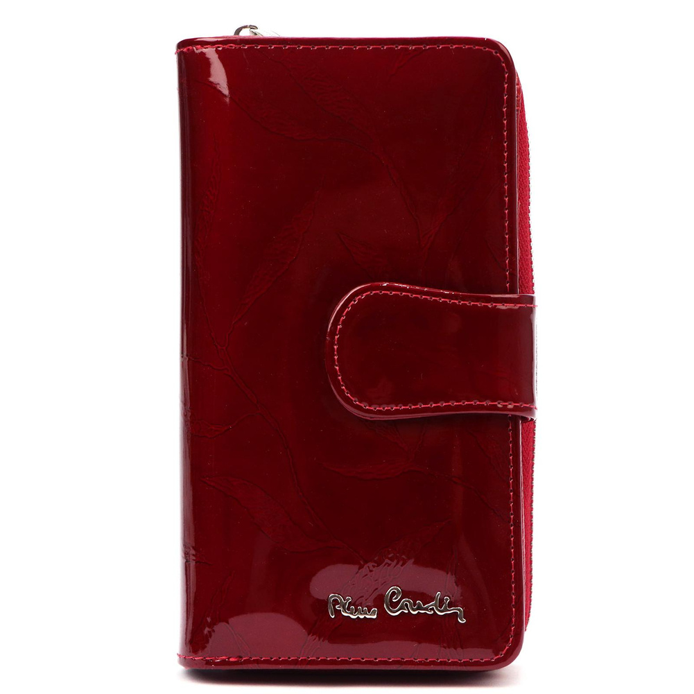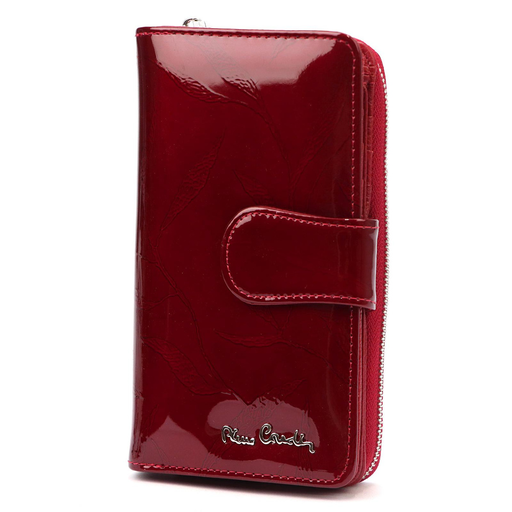 Duży portfel damski, wykonany z najwyższej jakości naturalnej, włoskiej skóry licowej lakierowanej, z wytłoczonym, delikatnym motywem liści. Budowa portfela: - orientacja pionowa, - dwie przegrody na banknoty, - szesnaście przegródek na karty magnetyczne, - dwa "okienka" na zdjęcie, - kieszeń na drobne, podzielona na dwie części przegródką zapinaną na suwak, zamykana na zamek błyskawiczny, - całość zamykana patką z zatrzaskiem. Portfel dostarczany jest w oryginalnym, firmowym pudełku - idealny na prezent.
