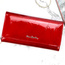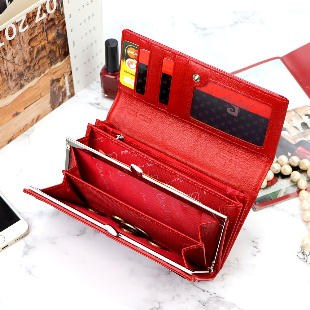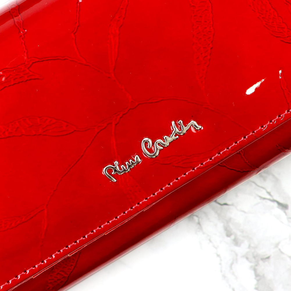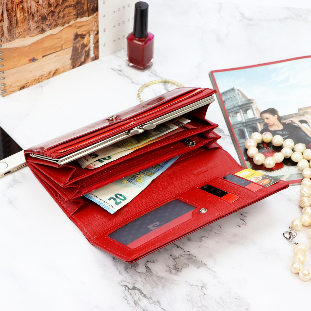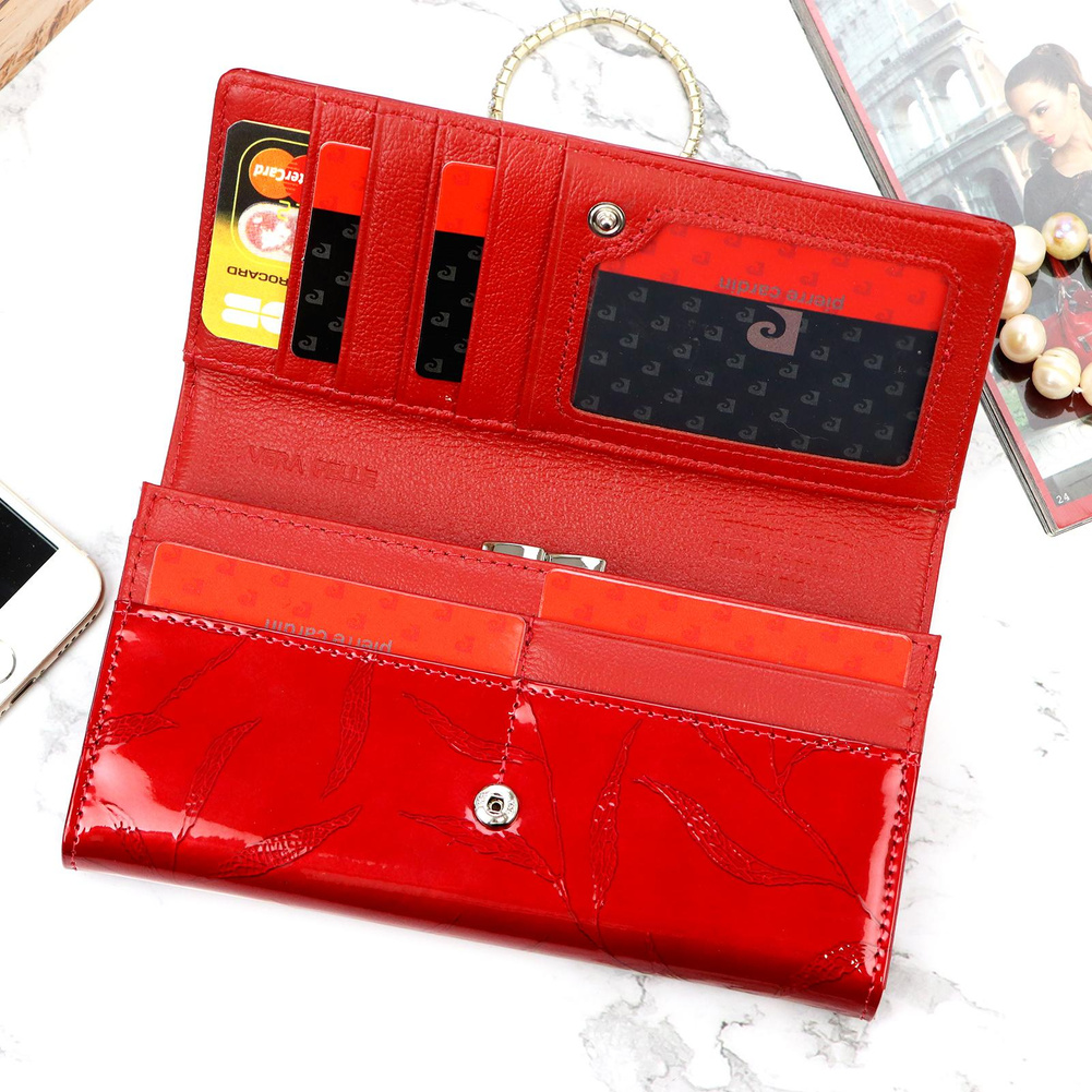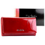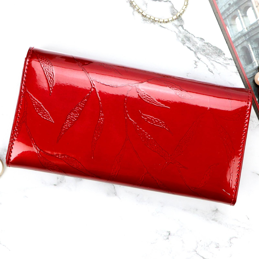 Duży portfel damski, wykonany z najwyższej jakości naturalnej, włoskiej skóry licowej lakierowanej, z wytłoczonym, delikatnym motywem liści. Budowa portfela: - orientacja pozioma, - trzy przegrody na banknoty (w jedną z przegród wszyto kieszonkę zapinaną na suwak), - osiem przegródek na karty magnetyczne, - "okienko" na zdjęcie, - kieszeń na drobne, podzielona na dwie części, zamykana na "bigiel", - całość zamykana klapą z zatrzaskiem. Portfel dostarczany jest w eleganckim, firmowym pudełku - idealny na prezent.