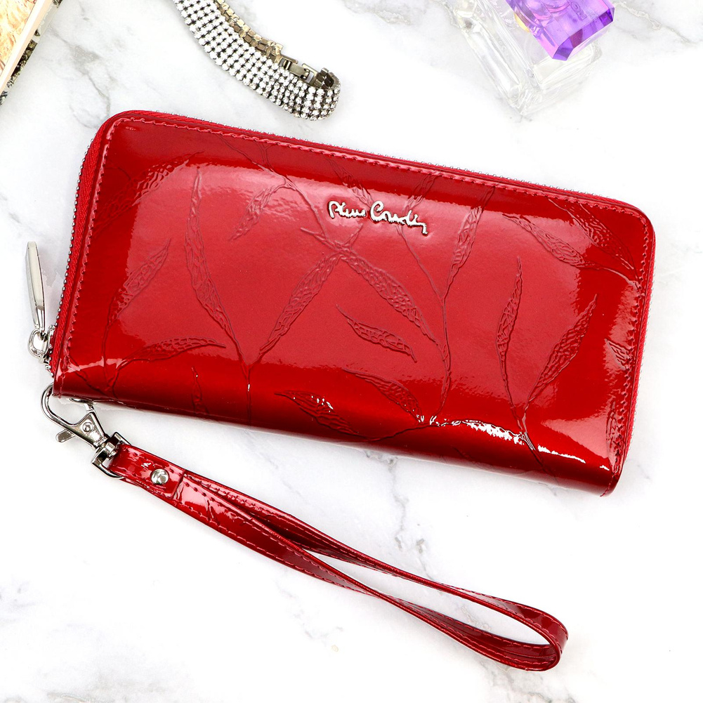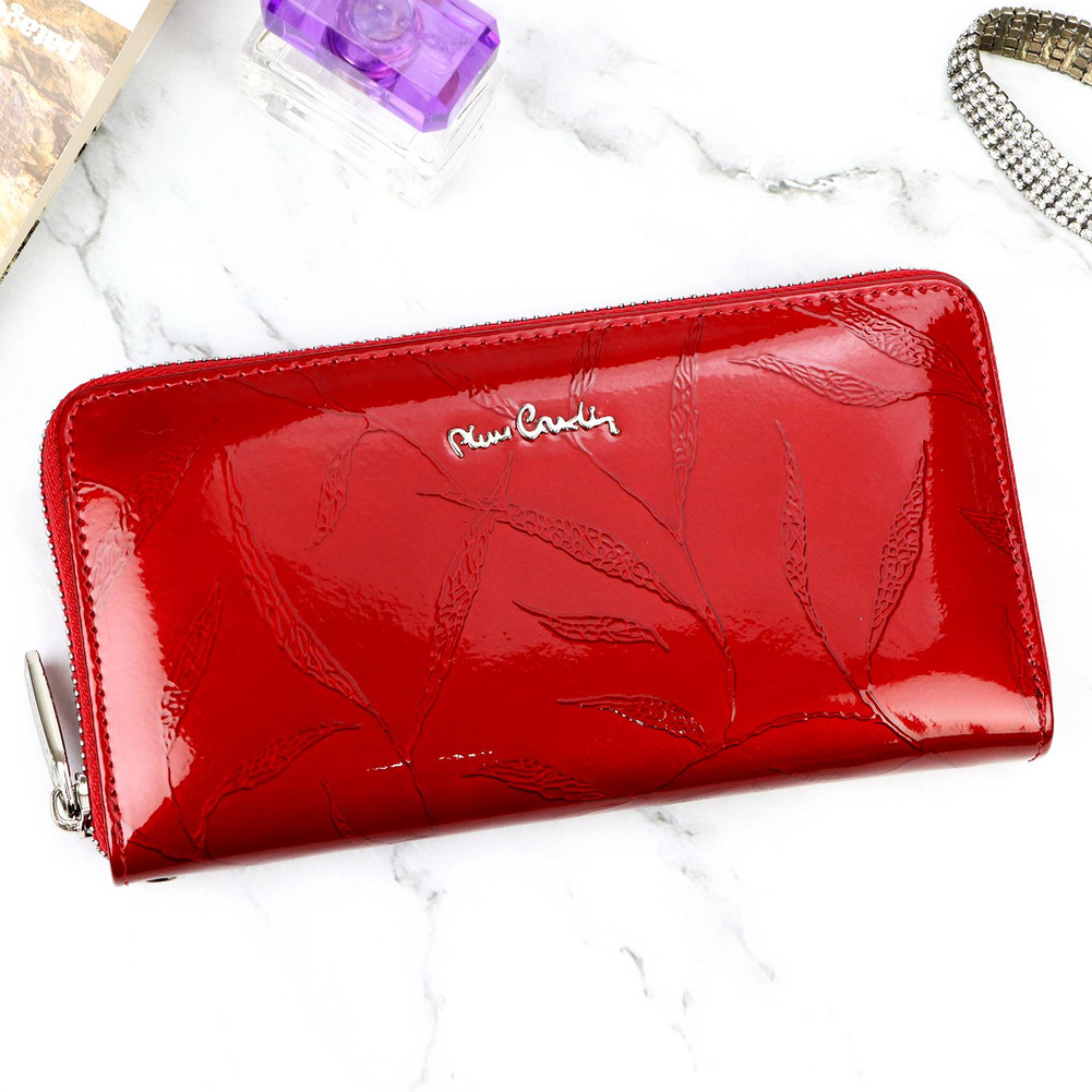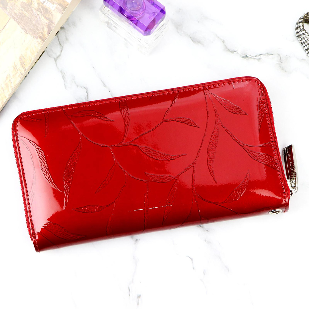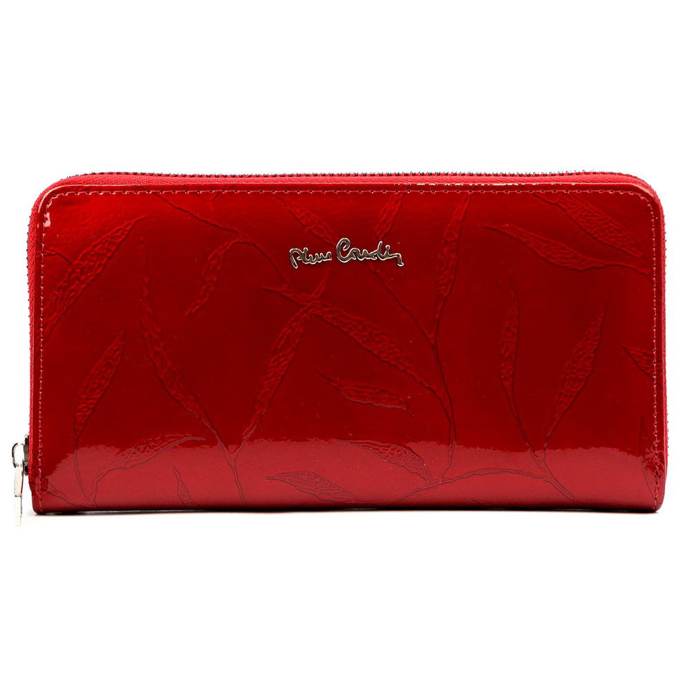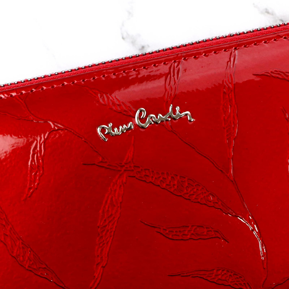 Duży portfel damski typu "piórnik", wykonany z najwyższej jakości naturalnej, włoskiej skóry licowej lakierowanej, z wytłoczonym, delikatnym motywem liści. Budowa portfela: - orientacja pozioma, - dwie przegrody na banknoty, - szesnaście przegródek na karty magnetyczne, - "okienko" na zdjęcie, - kieszeń na drobne, zamykana na zamek błyskawiczny, - całość zamykana mocnym, metalowym zamkiem błyskawicznym. Do portfela dołączono dopinaną "rączkę", która pozwala go nosić w ręku, jak kopertówkę. Portfel dostarczany jest w oryginalnym, firmowym pudełku - idealny na prezent.