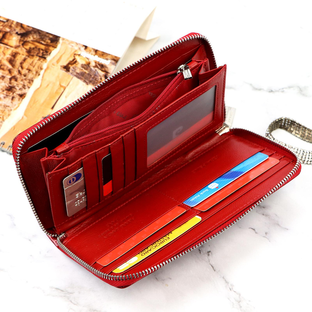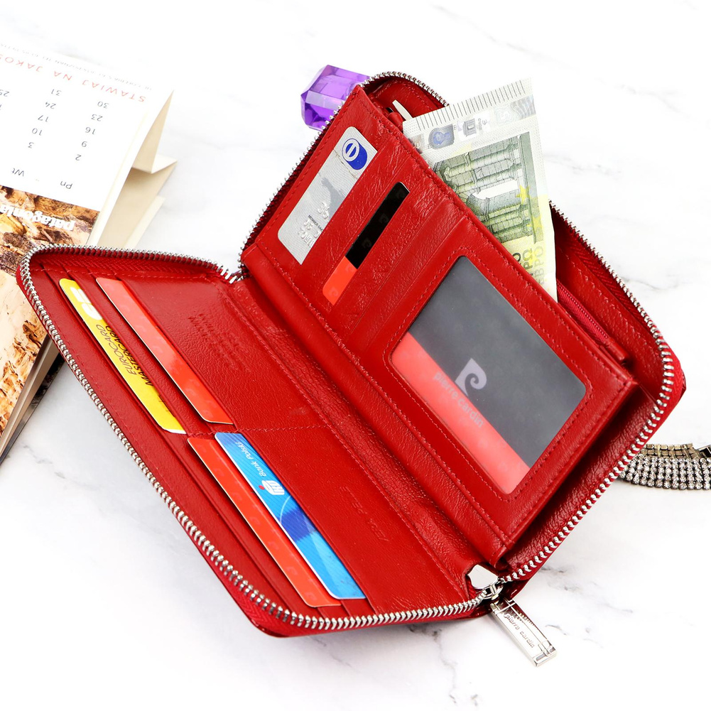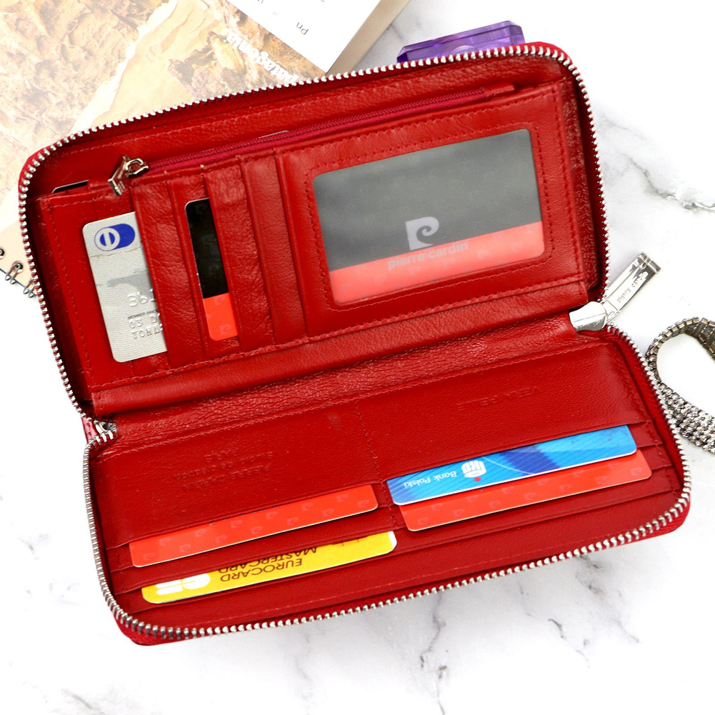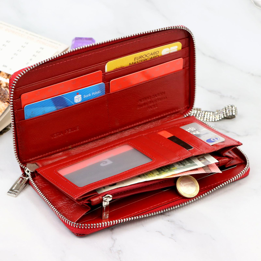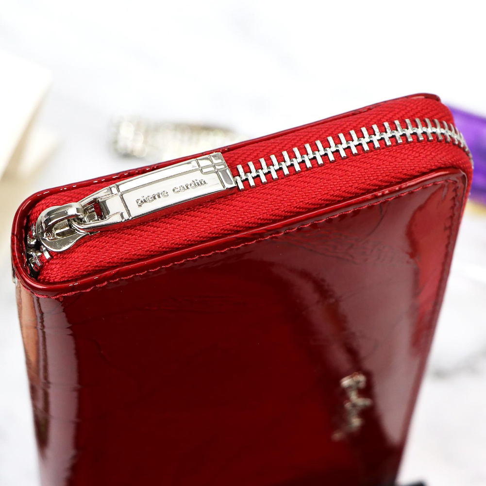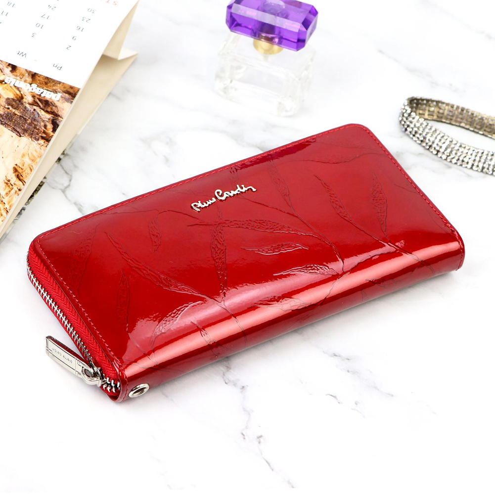 Duży portfel damski typu "piórnik", wykonany z najwyższej jakości naturalnej, włoskiej skóry licowej lakierowanej, z wytłoczonym, delikatnym motywem liści. Budowa portfela: - orientacja pozioma, - dwie przegrody na banknoty, - szesnaście przegródek na karty magnetyczne, - "okienko" na zdjęcie, - kieszeń na drobne, zamykana na zamek błyskawiczny, - całość zamykana mocnym, metalowym zamkiem błyskawicznym. Do portfela dołączono dopinaną "rączkę", która pozwala go nosić w ręku, jak kopertówkę. Portfel dostarczany jest w oryginalnym, firmowym pudełku - idealny na prezent.