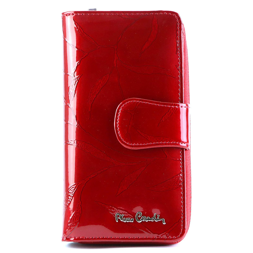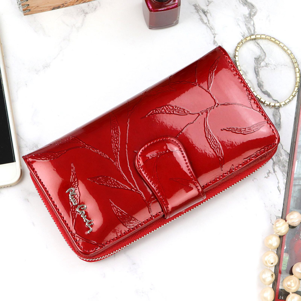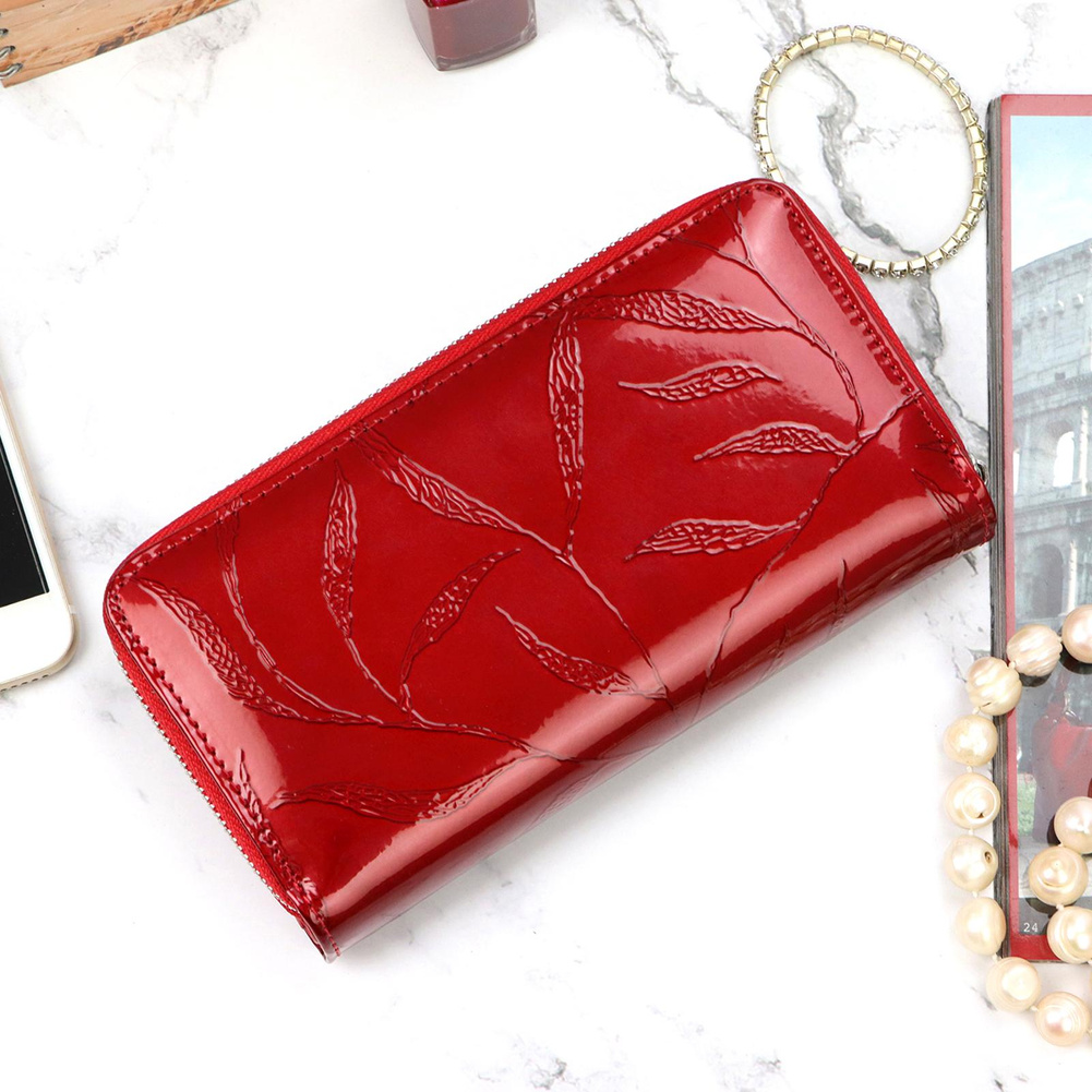 Duży portfel damski, wykonany z najwyższej jakości naturalnej, włoskiej skóry licowej lakierowanej, z wytłoczonym, delikatnym motywem liści. Budowa portfela: - orientacja pionowa, - dwie przegrody na banknoty, - szesnaście przegródek na karty magnetyczne, - dwa "okienka" na zdjęcie, - kieszeń na drobne, podzielona na dwie części przegródką zapinaną na suwak, zamykana na zamek błyskawiczny, - całość zamykana patką z zatrzaskiem. Portfel dostarczany jest w oryginalnym, firmowym pudełku - idealny na prezent.