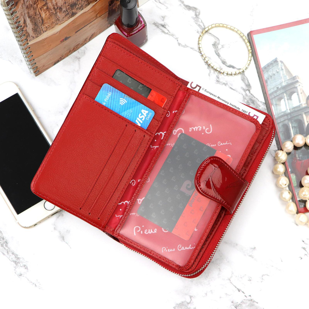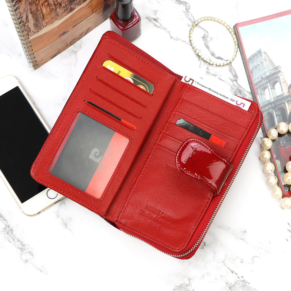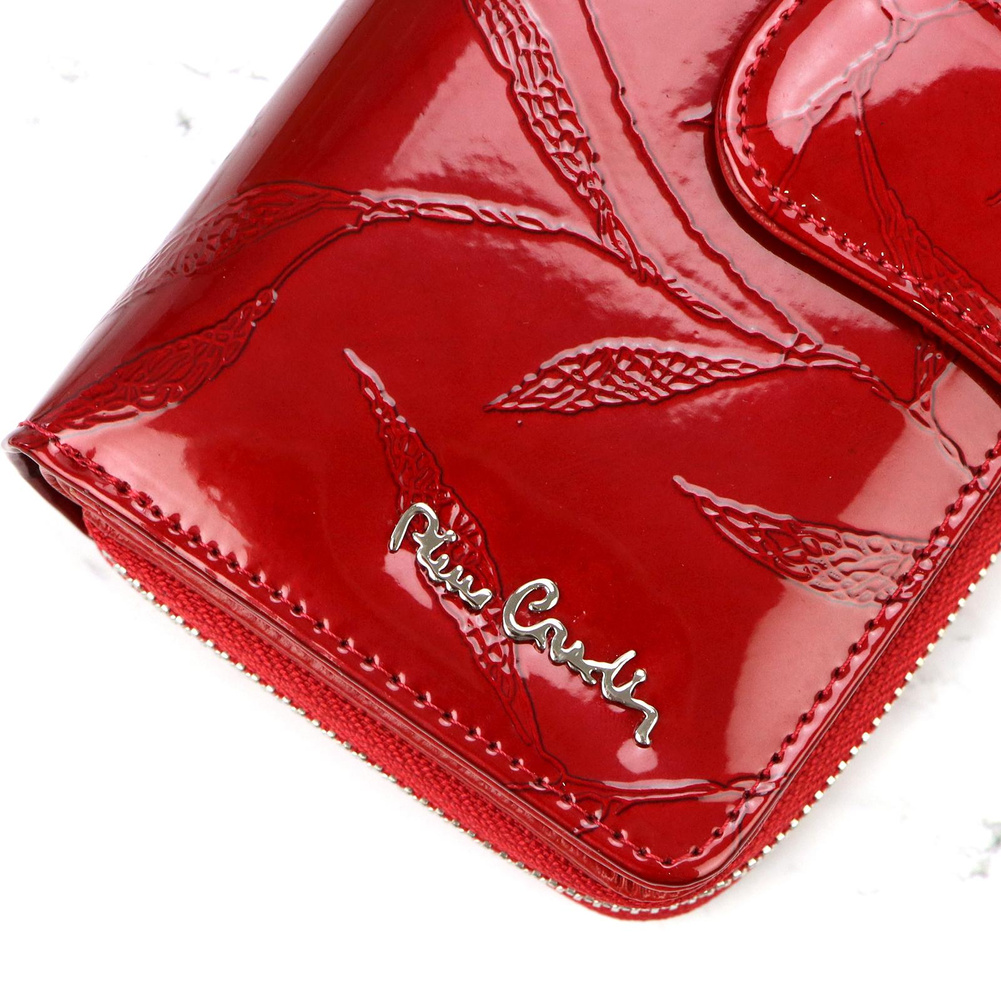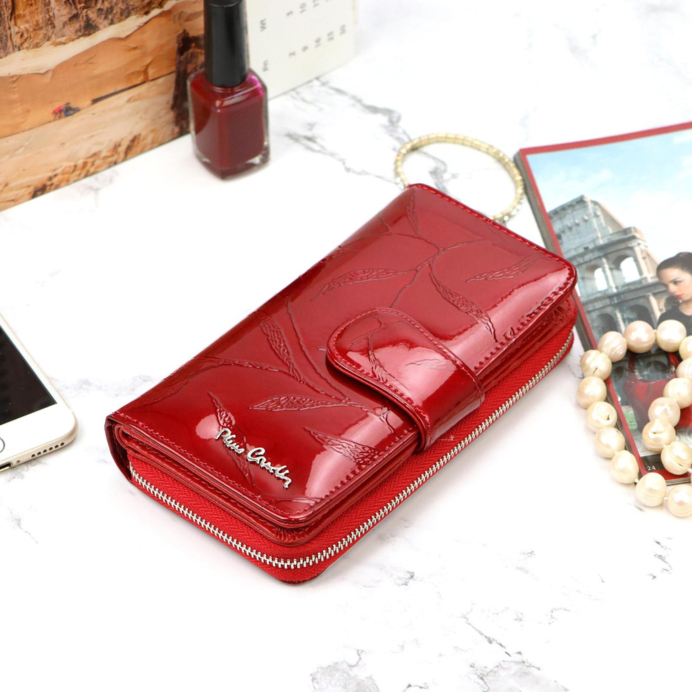 Duży portfel damski, wykonany z najwyższej jakości naturalnej, włoskiej skóry licowej lakierowanej, z wytłoczonym, delikatnym motywem liści. Budowa portfela: - orientacja pionowa, - dwie przegrody na banknoty, - szesnaście przegródek na karty magnetyczne, - dwa "okienka" na zdjęcie, - kieszeń na drobne, podzielona na dwie części przegródką zapinaną na suwak, zamykana na zamek błyskawiczny, - całość zamykana patką z zatrzaskiem. Portfel dostarczany jest w oryginalnym, firmowym pudełku - idealny na prezent.