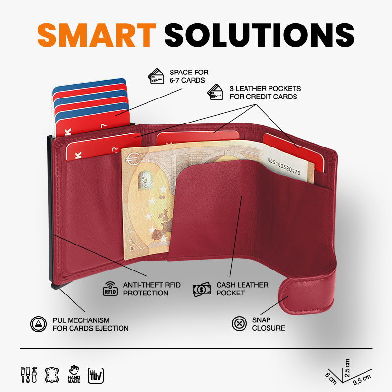 Wykonany z delikatnej, ekskluzywnej skóry Italia. Karty, banknoty - masz je zawsze pod ręką, uporządkowane w kilku łatwo dostępnych kieszonkach. Specjalny mechanizm stopniowego wysuwania kart zapewnia łatwy i szybki dostęp do zawartości portfela. Dzięki technologii blokowania RFID zastosowanej w designie portfela, Twoje wrażliwe dane oraz środki na kartach płatniczych są całkowicie bezpieczne i chronione przed nieautoryzowanym sczytaniem lub kradzieżą.