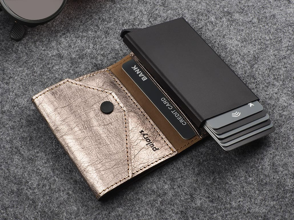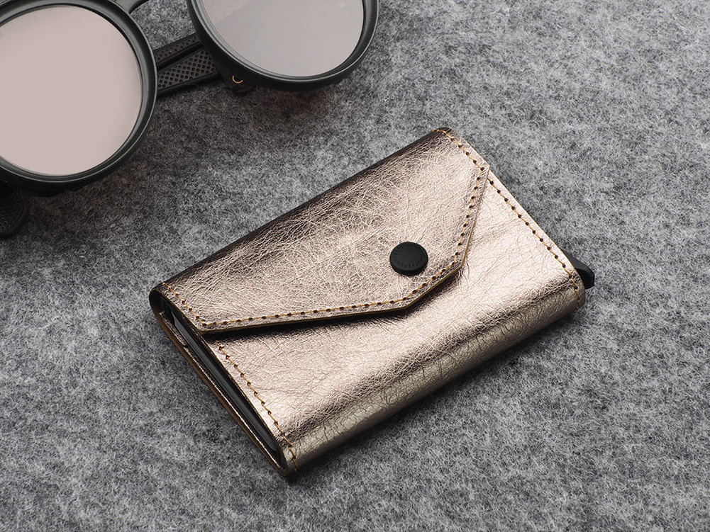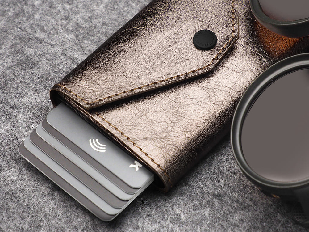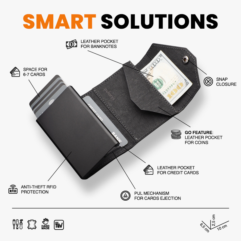 Wewnątrz kieszonka na dokumenty lub wizytówki oraz dodatkowa kieszonka na monety, zamykana klapką. Banknoty przechowasz w unikalnej przegródce wykonanej w całości z papieru Wash Paper. Specjalny mechanizm stopniowego wysuwania kart, zapewnia do nich szybki i łatwy dostęp. Dzięki zastosowanej w konstrukcji portfela technologii blokowania RFID, Twoje wrażliwe dane oraz środki na kartach płatniczych są całkowicie bezpieczne i chronione przed nieautoryzowanym skanowaniem lub kradzieżą.