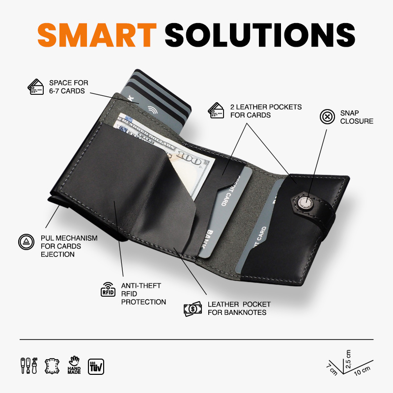 Dwie łatwo dostępne kieszonki idealnie zorganizują dokumenty, karty lub wizytówki. Dodatkowym atutem jest unikalna przegródka na banknoty, wykonana w całości ze skóry. Dzięki technologii blokowania RFID zastosowanej w designie portfela, Twoje wrażliwe dane oraz środki na kartach płatniczych są całkowicie bezpieczne i chronione przed nieautoryzowanym sczytaniem lub kradzieżą. Specjalny mechanizm stopniowego wysuwania kart pozwala szybko sięgnąć po tę, której szukamy.
