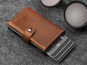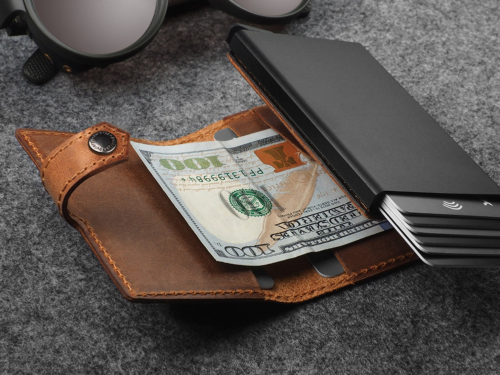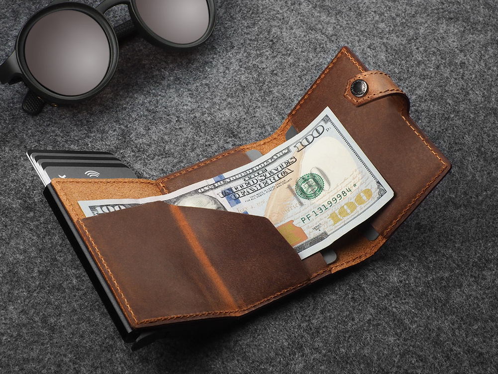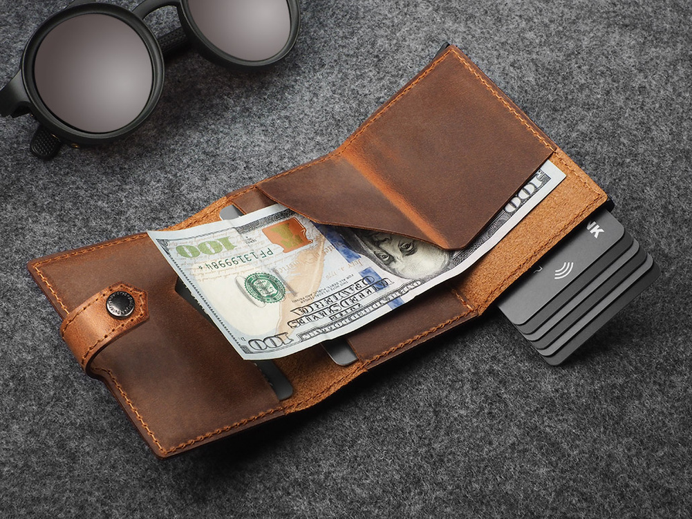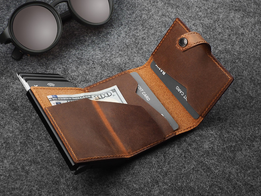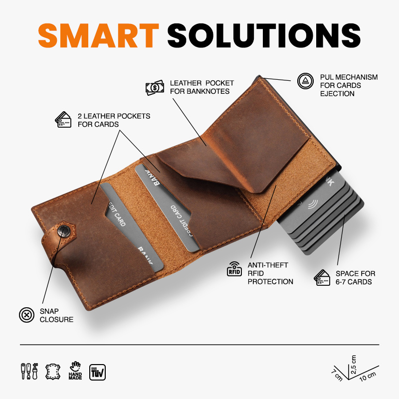 Dwie łatwo dostępne kieszonki idealnie zorganizują dokumenty, karty lub wizytówki. Dodatkowym atutem jest unikalna przegródka na banknoty, wykonana w całości ze skóry. Dzięki technologii blokowania RFID zastosowanej w designie portfela, Twoje wrażliwe dane oraz środki na kartach płatniczych są całkowicie bezpieczne i chronione przed nieautoryzowanym sczytaniem lub kradzieżą. Specjalny mechanizm stopniowego wysuwania kart pozwala szybko sięgnąć po tę, której szukamy.
