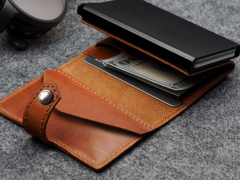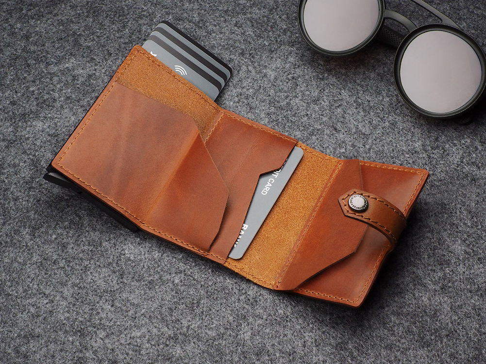 Rozmiar: 7 x 10 x 2,5 cm Materiał: Skóra Nomad Skórzana kieszeń na banknoty Kieszonka na monety Mieści 8 kart Wzór zarejestrowany ® Zabezpieczenie RFID Zapięcie na zatrzask Mały portfel o bogatym wnętrzu.