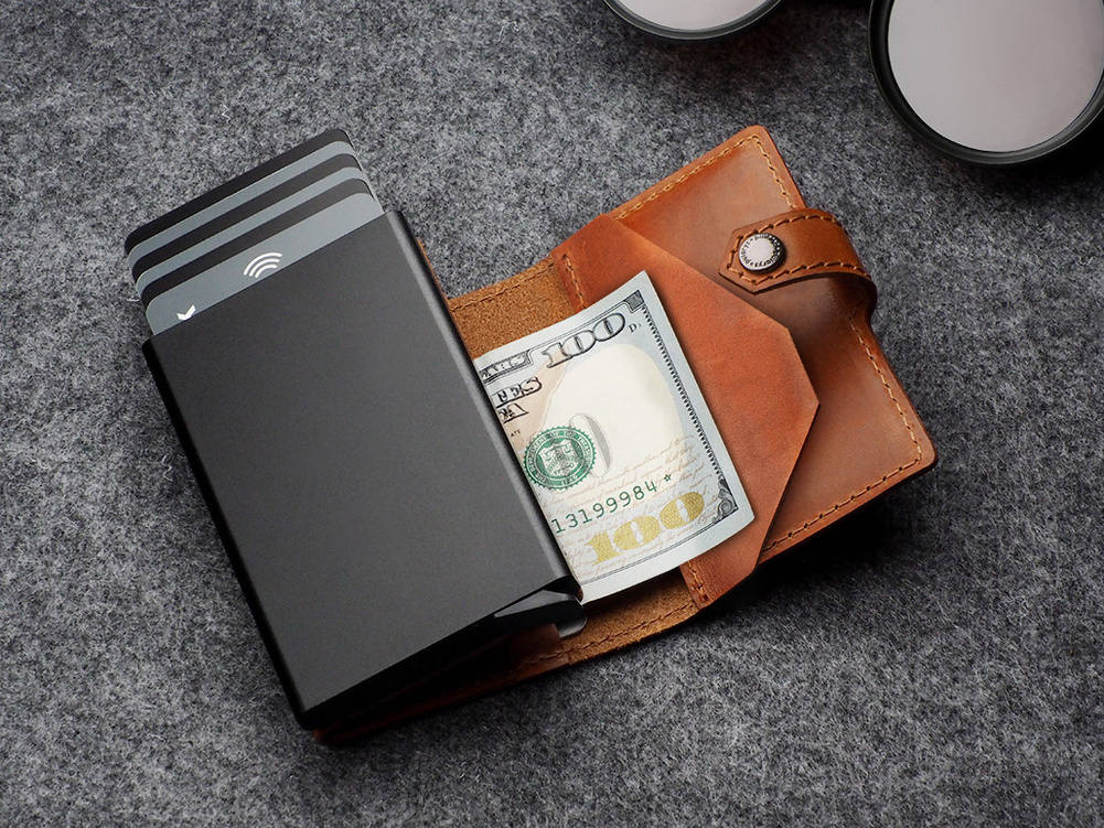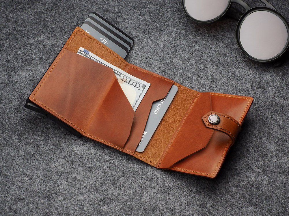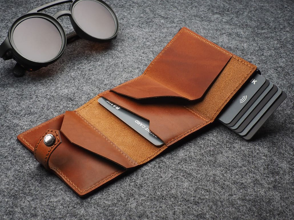 Wewnątrz kieszonka na dokumenty lub wizytówki oraz dodatkowa kieszonka na monety, zamykana klapką. Banknoty przechowasz w unikalnej przegródce wykonanej w całości ze skóry. Dzięki technologii blokowania RFID zastosowanej w designie portfela, Twoje wrażliwe dane oraz środki na kartach płatniczych są całkowicie bezpieczne i chronione przed nieautoryzowanym sczytaniem lub kradzieżą. Specjalny mechanizm stopniowego wysuwania kart pozwala szybko sięgnąć po tę, której szukamy.