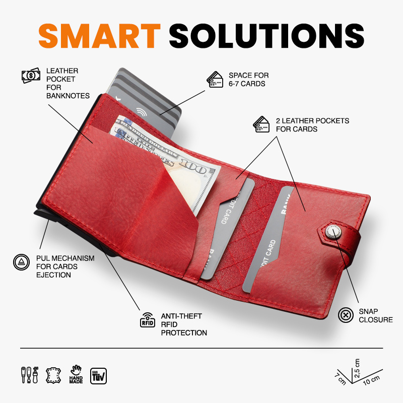 Karty i banknoty masz zawsze pod ręką, uporządkowane w dwóch łatwo dostępnych kieszonkach. Dodatkowym ułatwieniem jest elastyczna gumka na banknoty i nie tylko. Dzięki technologii RFID zastosowanej w designie portfela, Twoje wrażliwe dane oraz środki na kartach płatniczych są całkowicie bezpieczne i chronione przed nieautoryzowanym sczytaniem lub kradzieżą. Specjalny mechanizm stopniowego wysuwania kart pozwala szybko sięgnąć po tę, której szukamy. Wzór zarejestrowany - unikalny i oryginalny!
