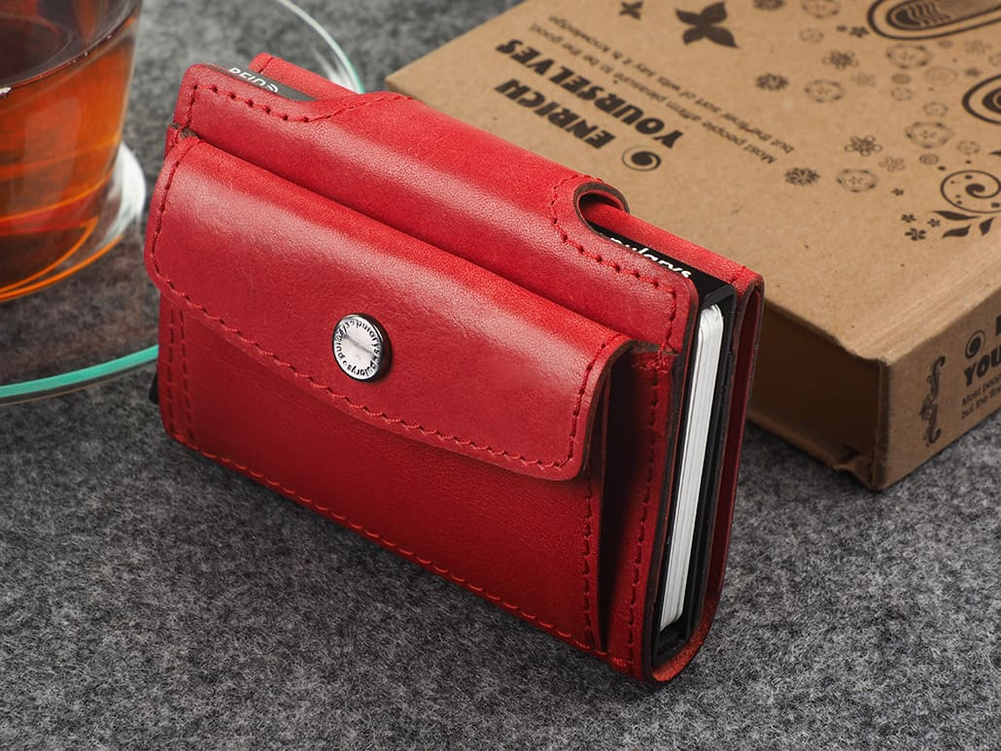 Rozmiar: 6,5 x 9,5 x 2,5 cm Materiał: Skóra Nomad Skórzana kieszeń na banknoty Kieszeń na bilon Mieści 8 kart Wzór zarejestrowany ® Zabezpieczenie RFID Zapięcie na 2 zatrzaski Smukły portfel do zadań specjalnych!