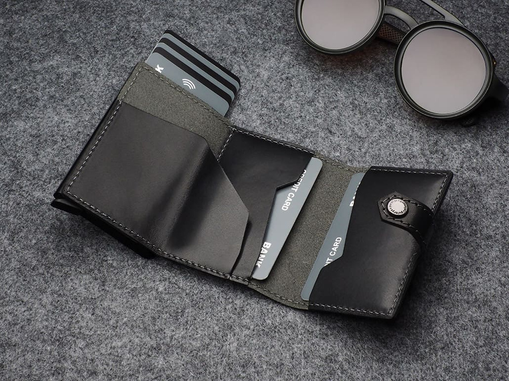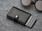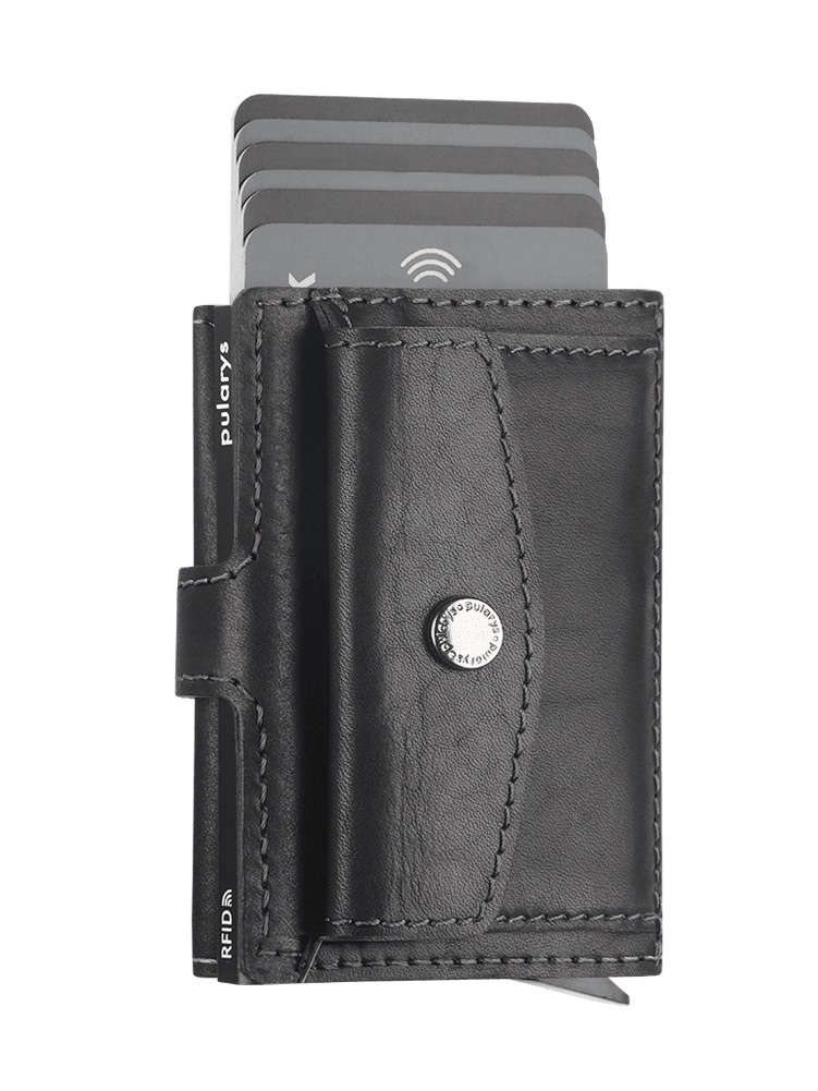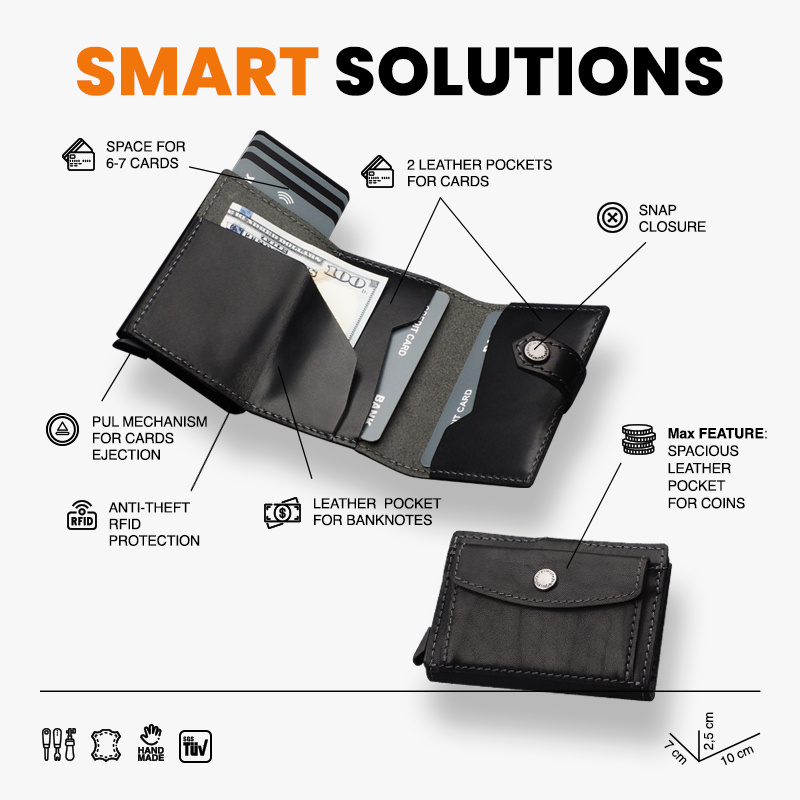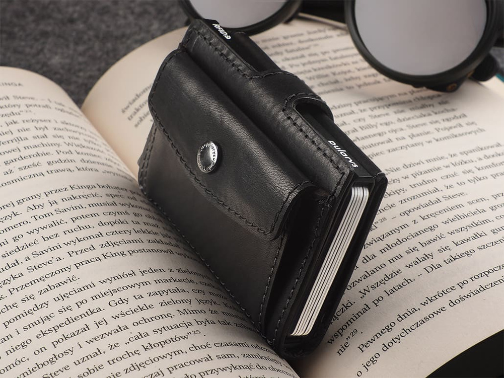 Dwie łatwo dostępne kieszonki idealnie zorganizują dokumenty, karty lub wizytówki. Dodatkowym atutem jest unikalna przegródka na banknoty, wykonana w całości ze skóry. Niezbędny bilon przechowasz w eleganckiej, zewnętrznej kieszonce. Dzięki technologii blokowania RFID zastosowanej w designie portfela, Twoje wrażliwe dane oraz środki na kartach płatniczych są całkowicie bezpieczne i chronione przed nieautoryzowanym sczytaniem lub kradzieżą. Specjalny mechanizm stopniowego wysuwania kart pozwala szybko sięgnąć po tę, której szukamy.